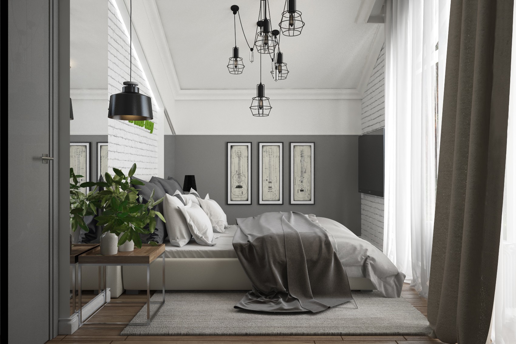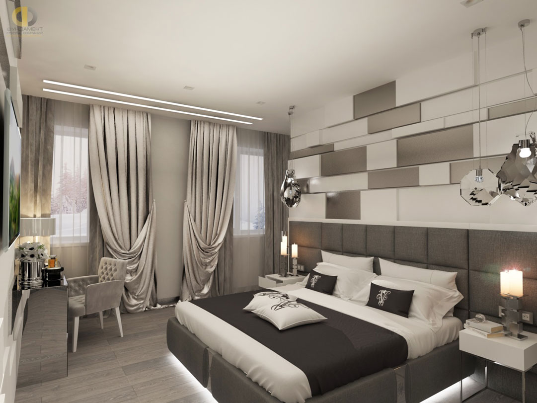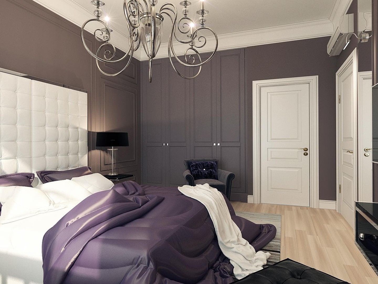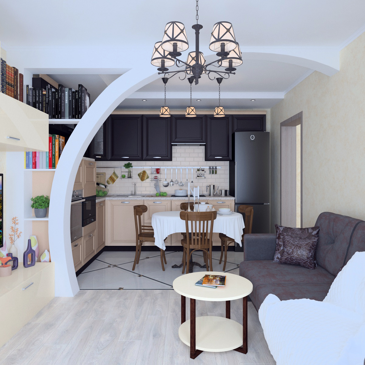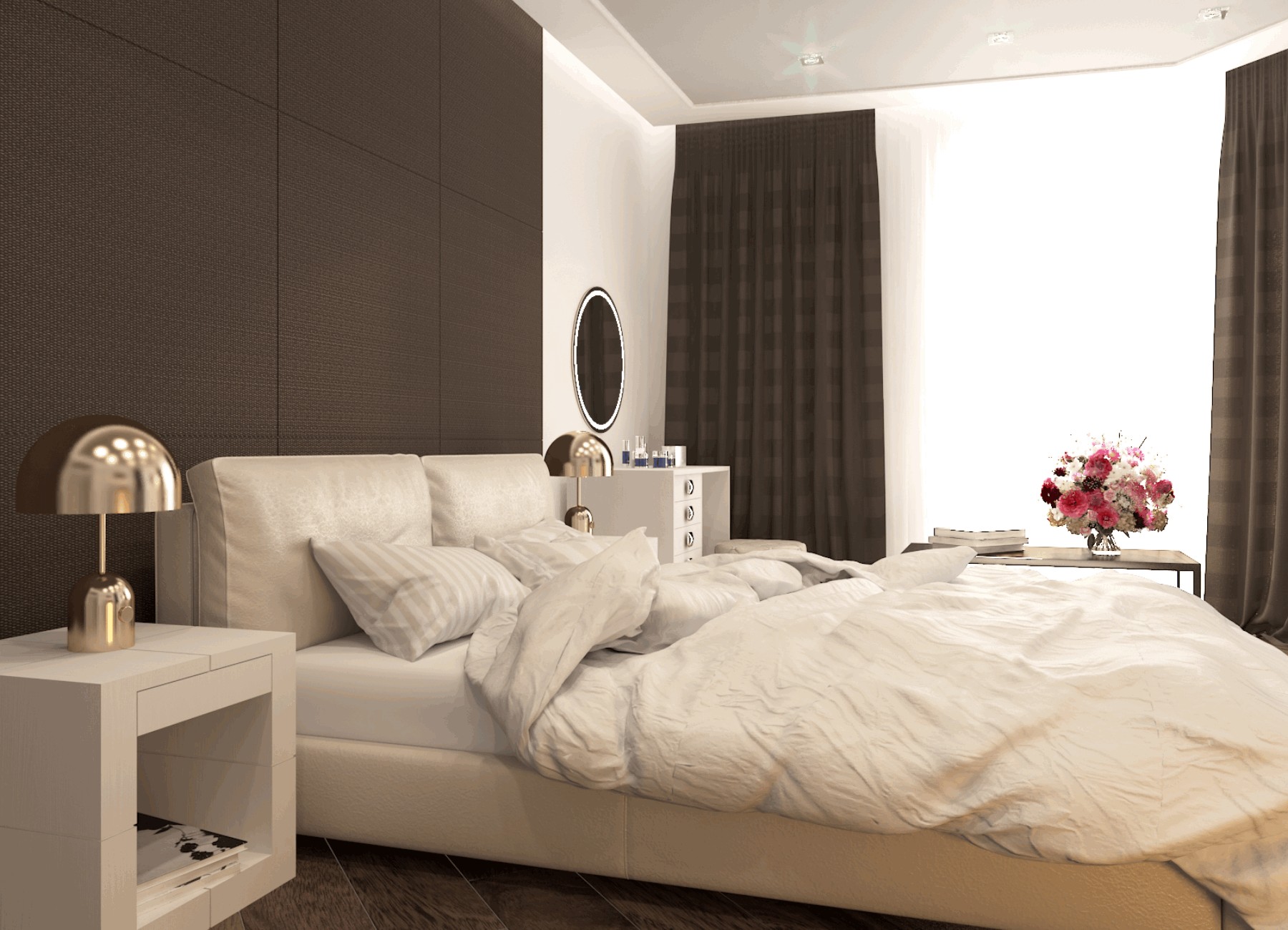 Para o interior do quarto, escolha uma paleta neutra que acrescente facilidade de espaço. Aderir às regras de zoneamento, isto é, as portas são substituídas por arcos, decorados com colunas e semicolunas com padrões antigos. O número de eletrodomésticos é minimizado.