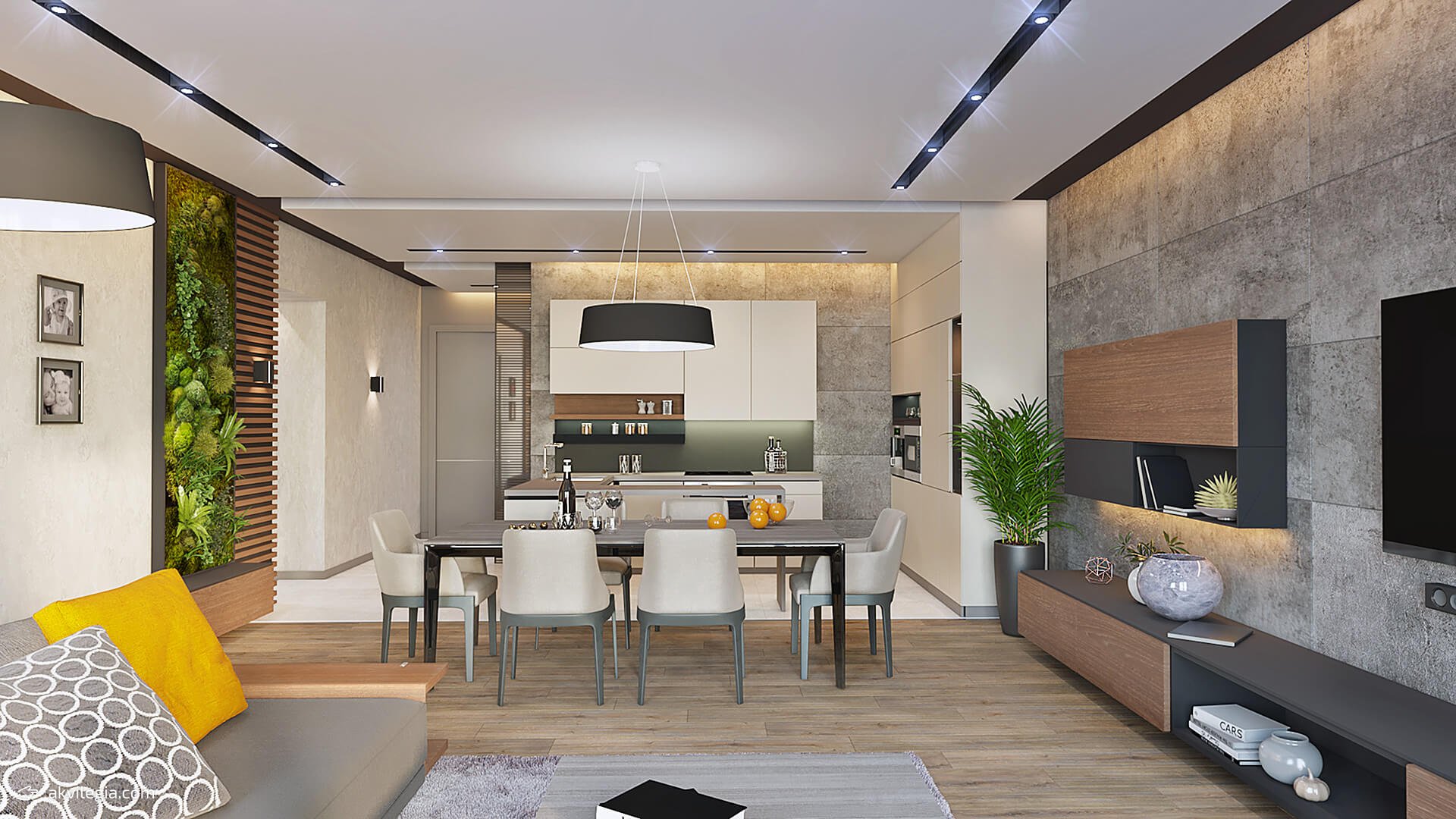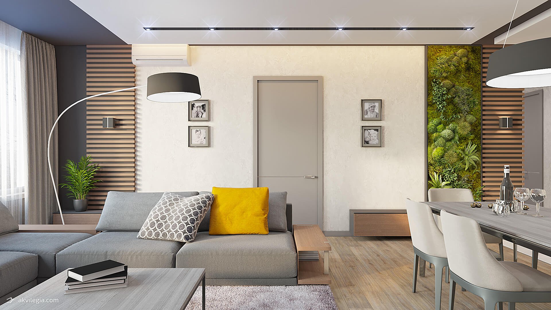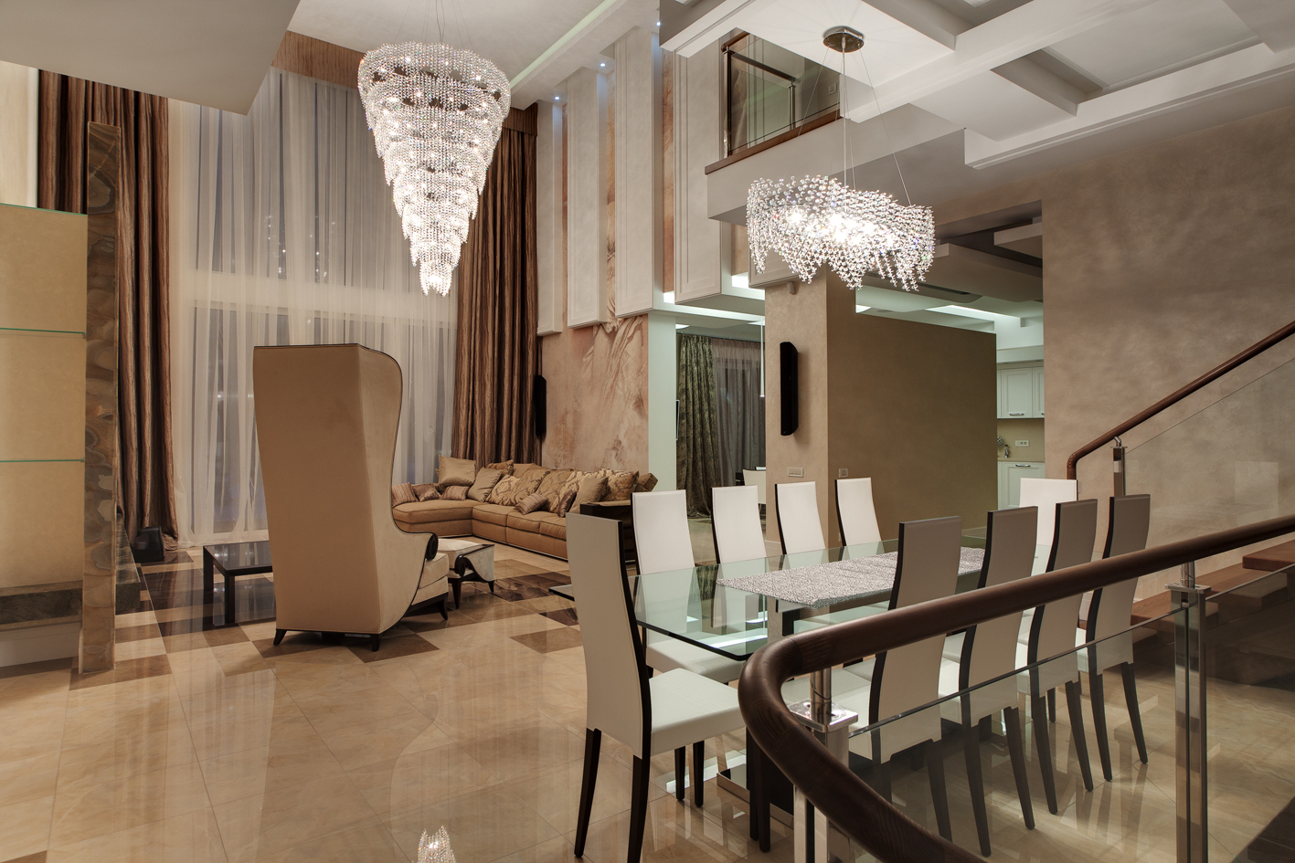 - Na grande sala de estar, todas as partições são demolidas, para o zoneamento elas usam arcos e colunas.