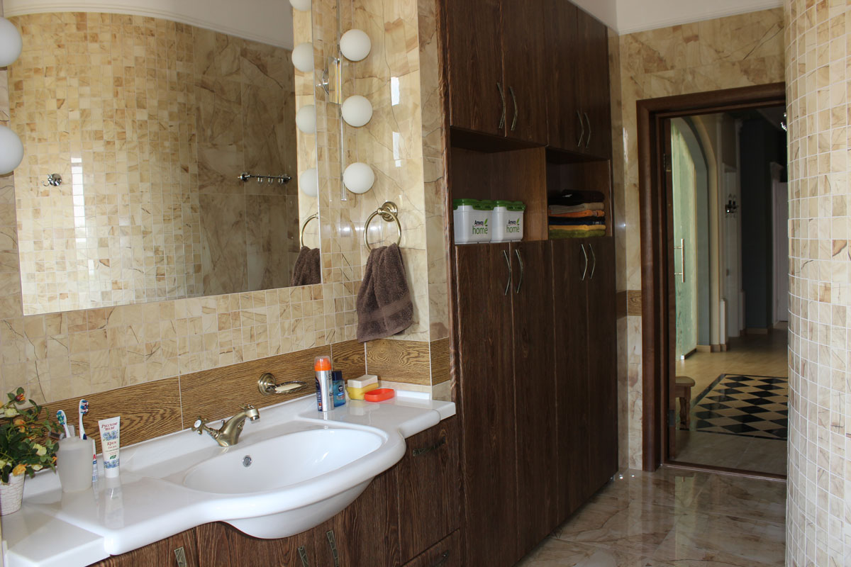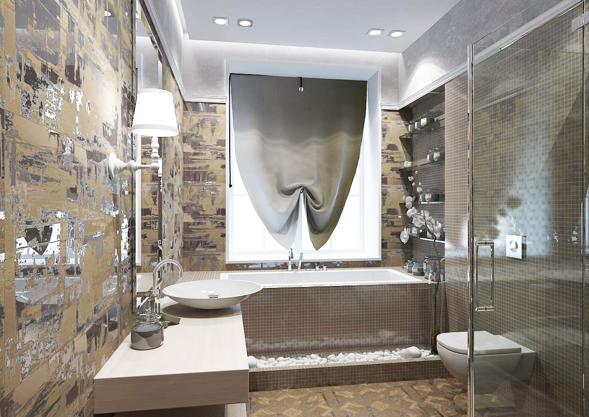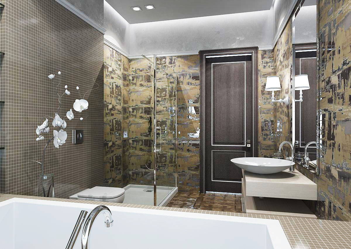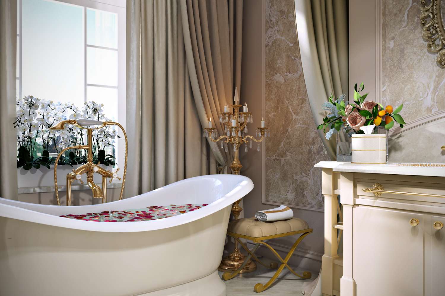 O banheiro encontra o interior neoclássico: encanamento de luxo, torneiras banhadas a ouro, bancadas sólidas, móveis padrão com acessórios antigos. O espaçoso quarto envolve a instalação de uma casa de banho no meio e não a encaixa entre as três paredes.