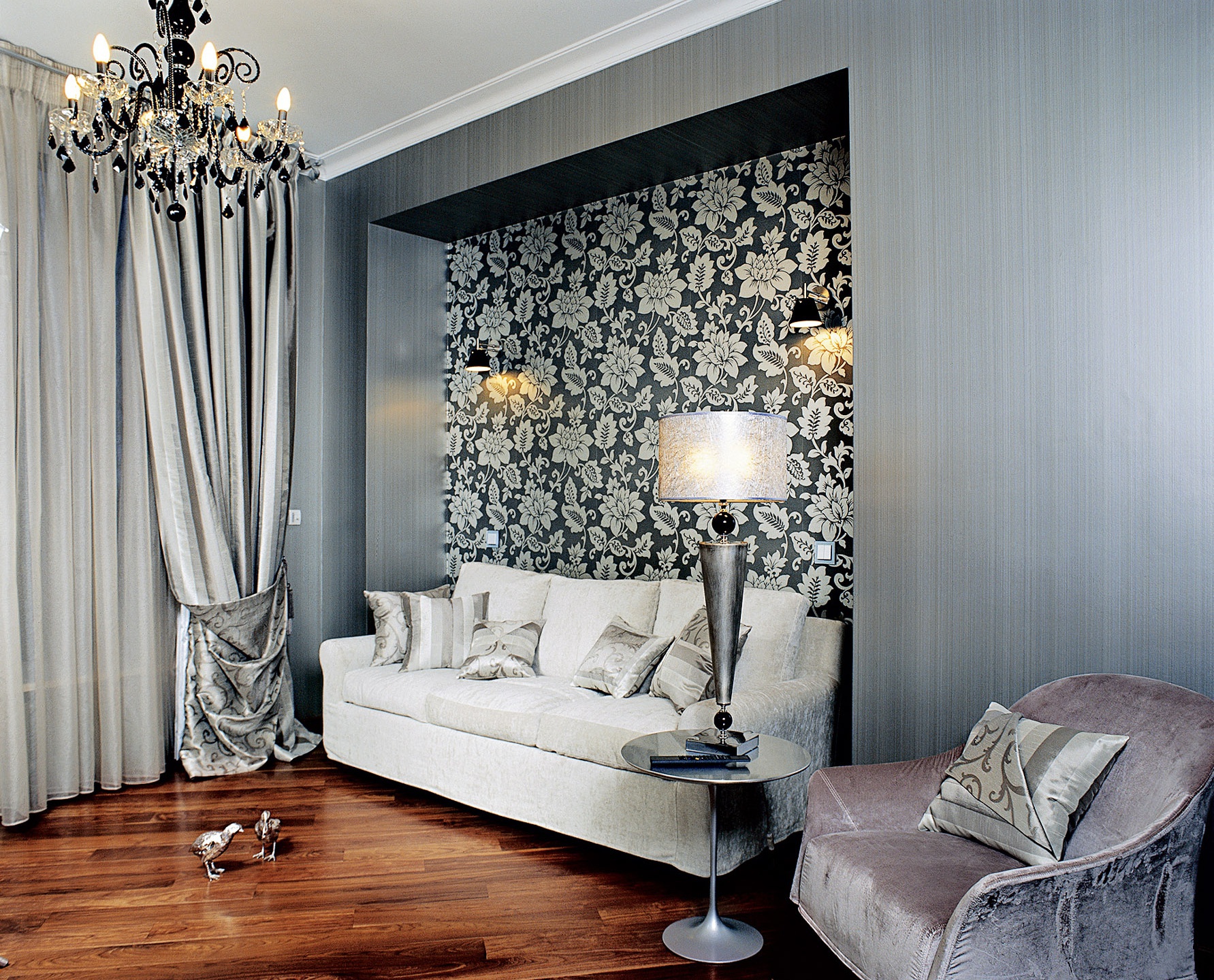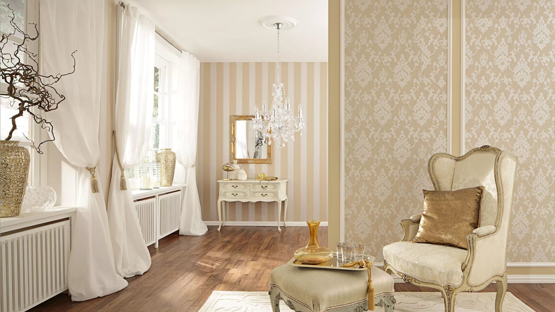 Olhar lindamente papel de parede com uma superfície brilhante, melhorando o brilho da iluminação. Faíscas de nácar darão pompa ao quarto. Use para furar papel de parede com padrões discretos na cor pastel da tela. Visualmente "elevar" papel de parede de tetos baixos com listras verticais largas.