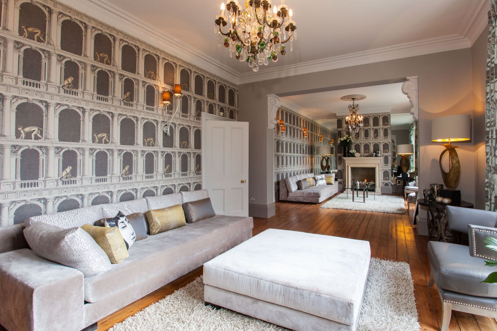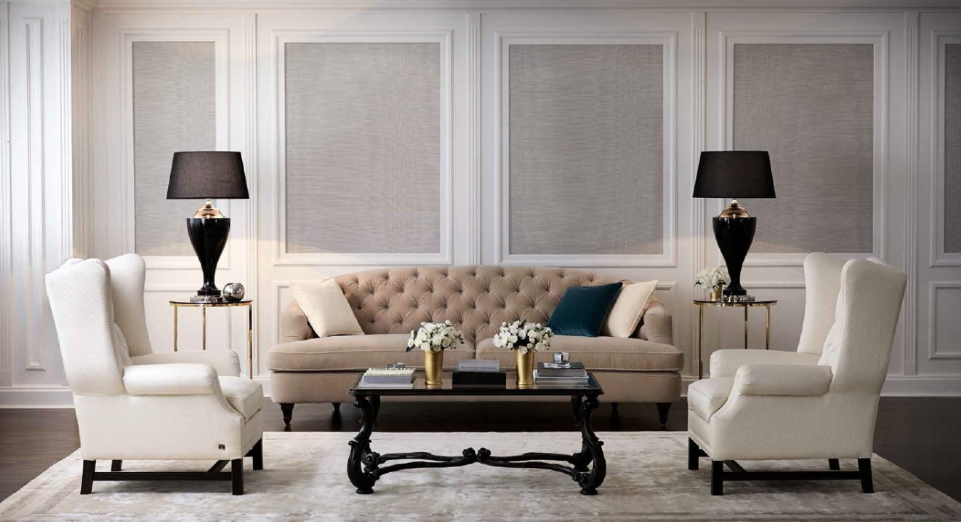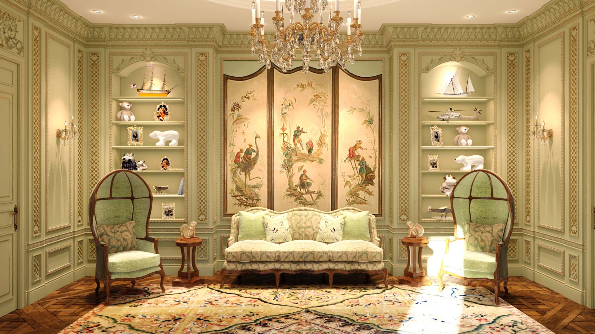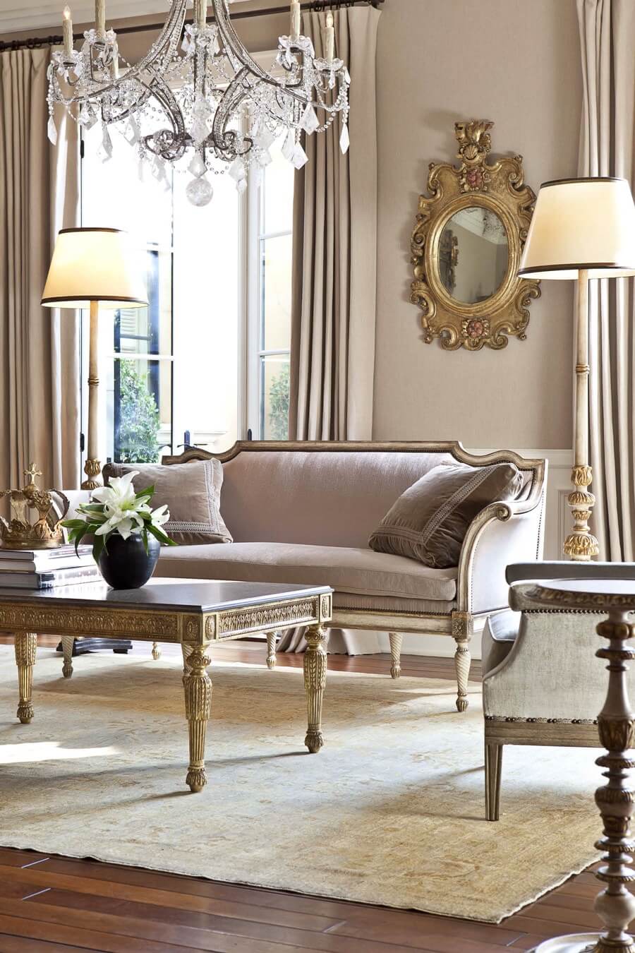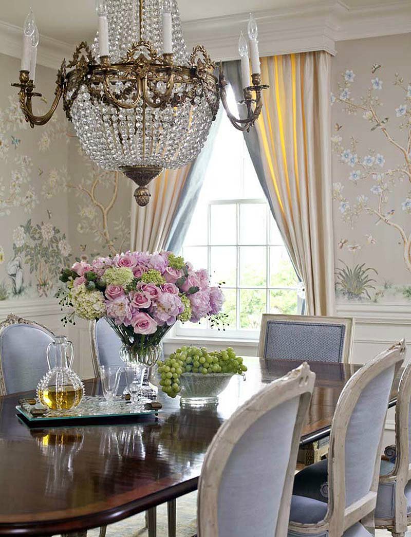 - O mobiliário é revestido com tecido caro em uma paleta pastel usando uma técnica especial "carruagem screed".