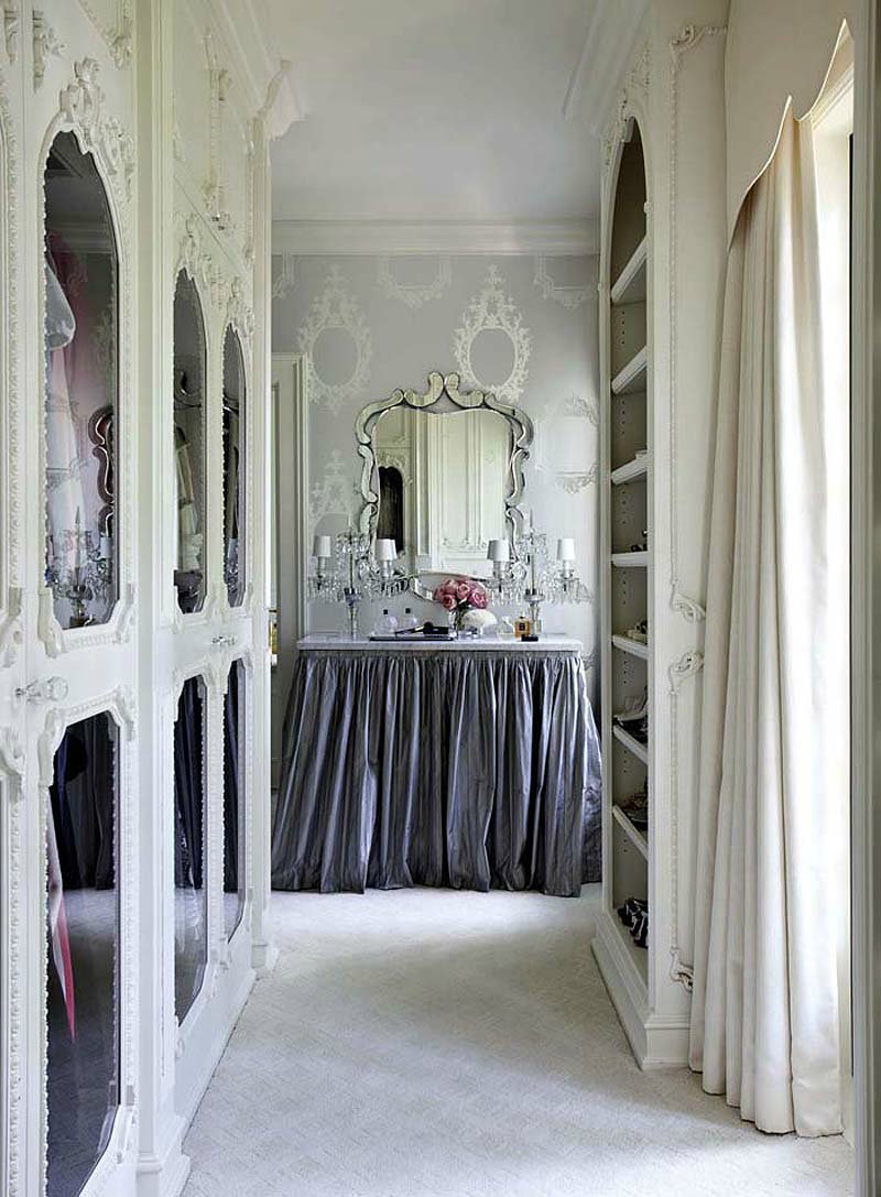 - Armários altos são colocados separadamente ou embutidos. O neoclassicismo sugere decorar as portas dos armários com espelho ou superfícies de vidro.