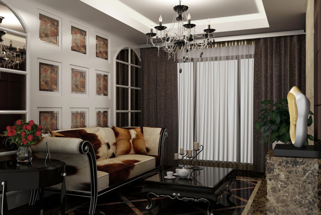 - No centro do teto tem um designer forjado o lustre. O interior assume uma abundância de luz, portanto, instale parede e mesa luminárias, lâmpadas de assoalho nas pernas dobradas.