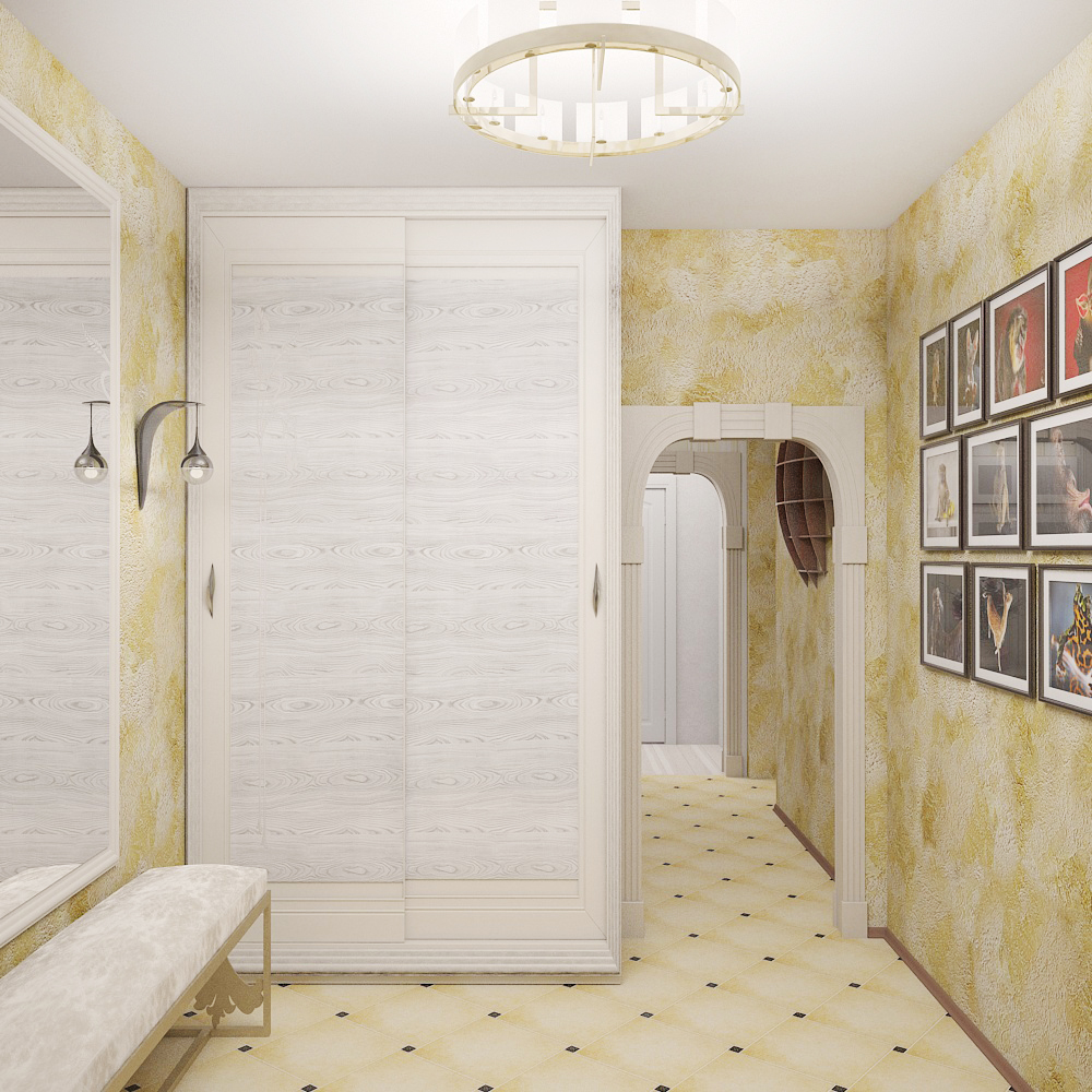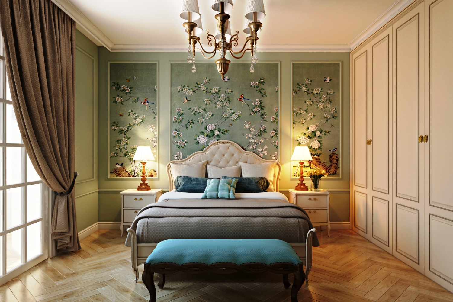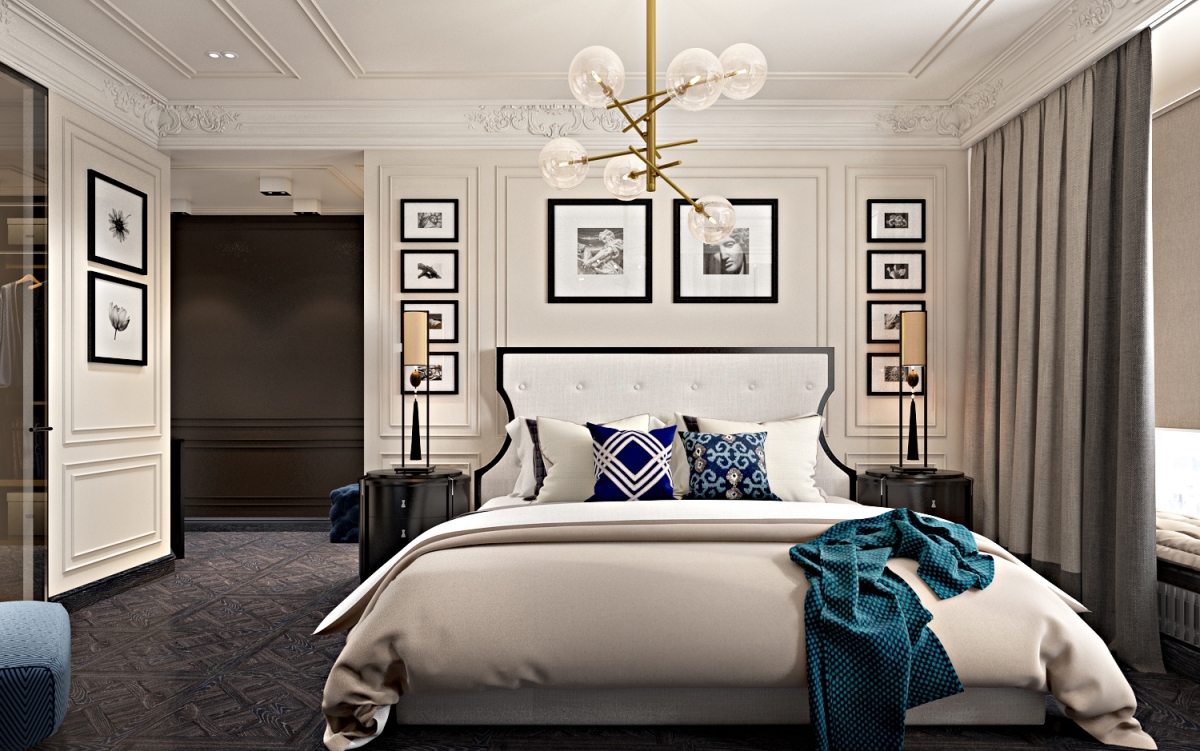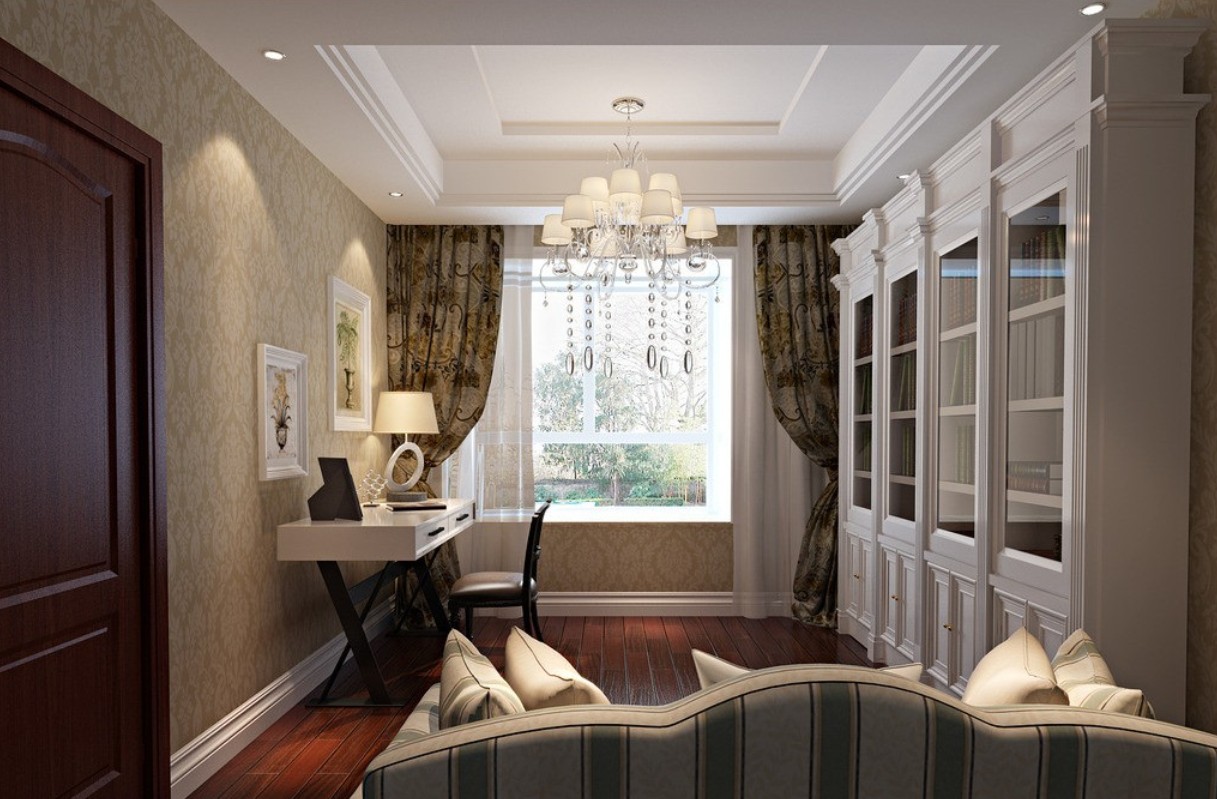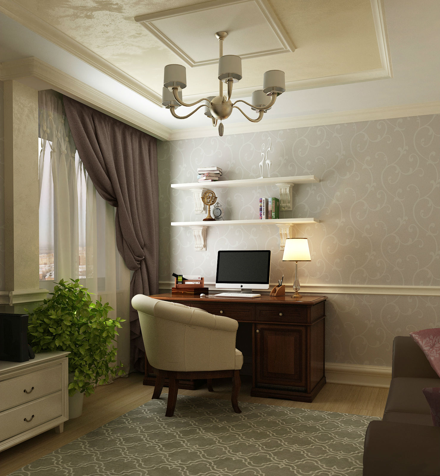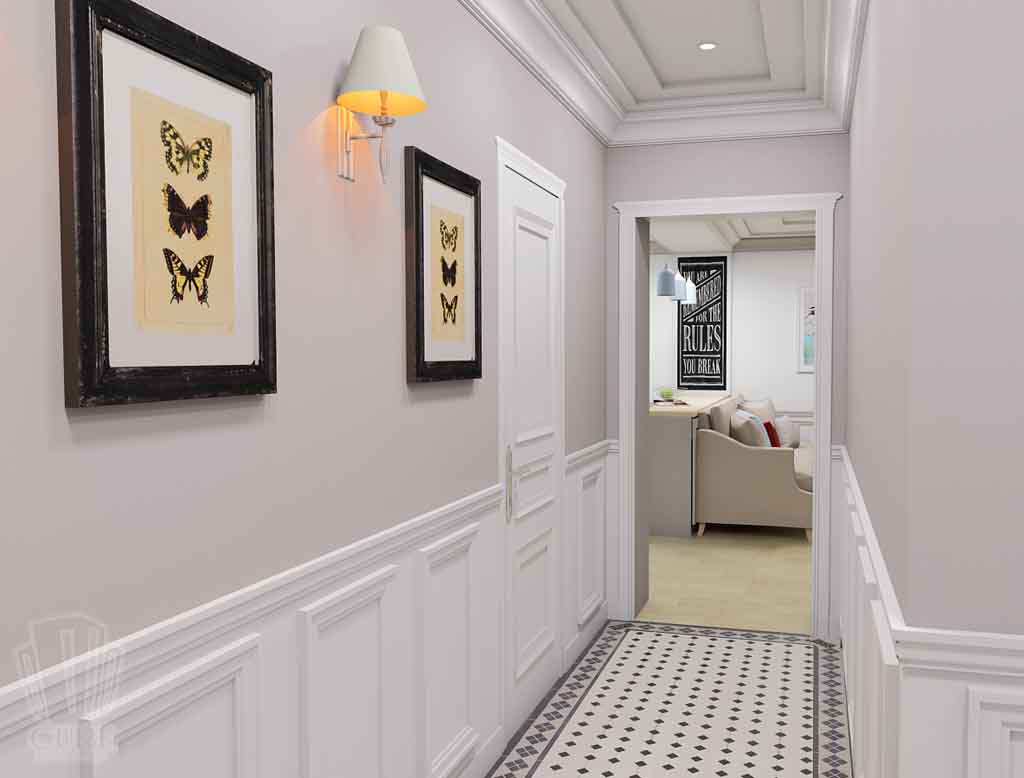 O neoclassicismo se manifesta no design das paredes. As paredes são divididas em partes superior e inferior para criar um ambiente rico. A transição entre eles é denotada por uma fita de papel de parede com tom de café: