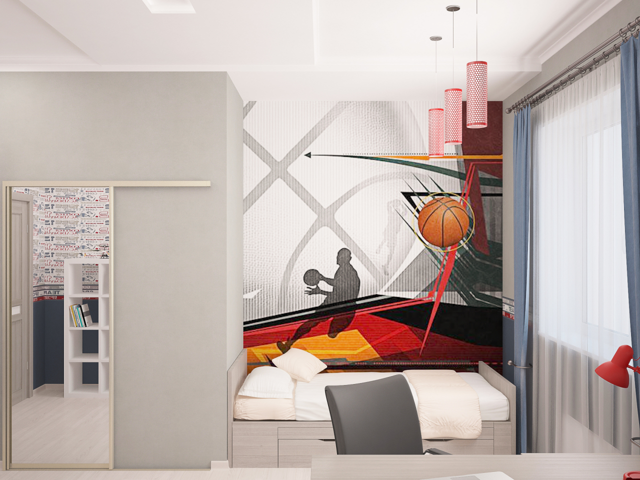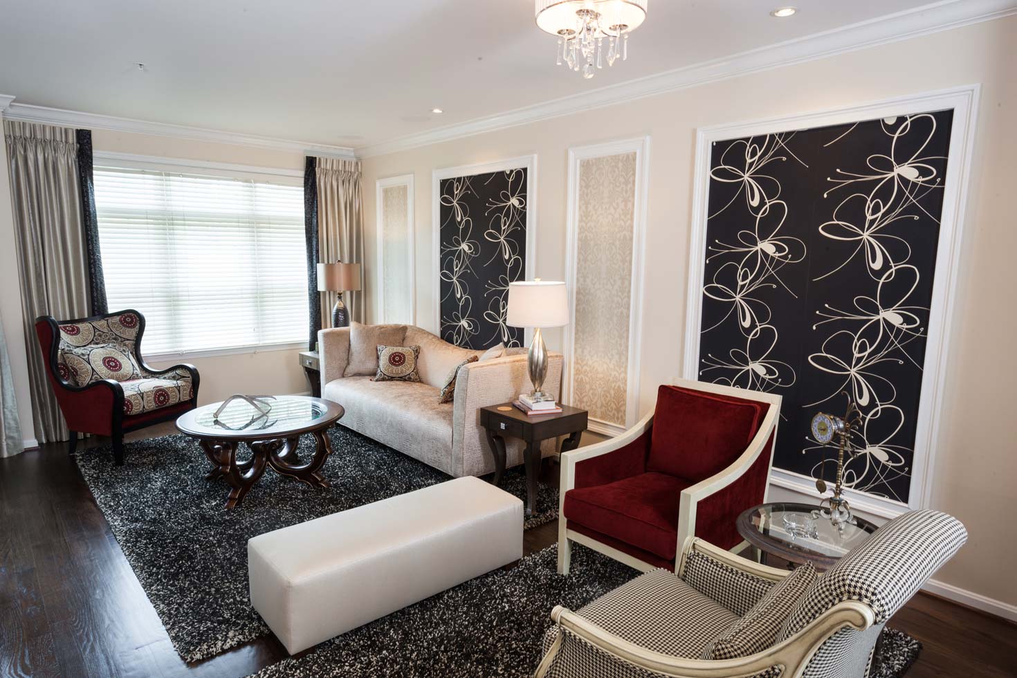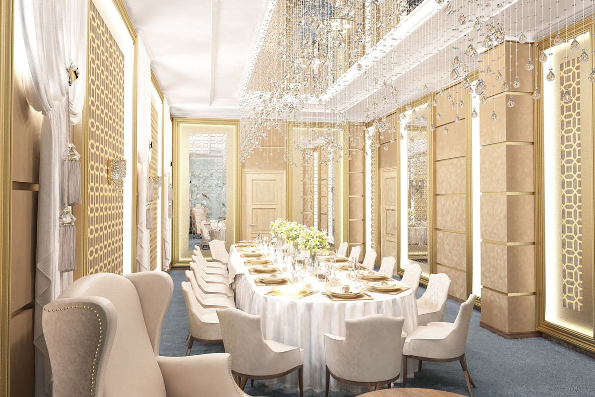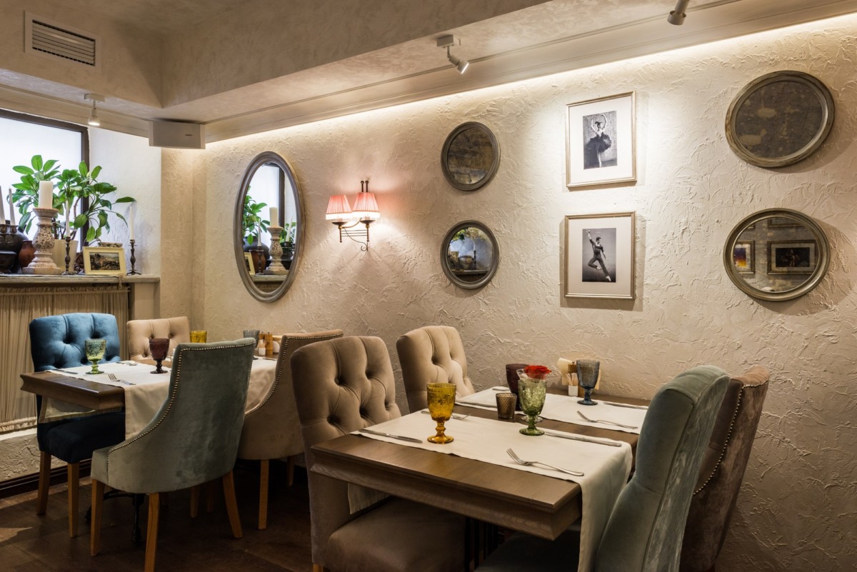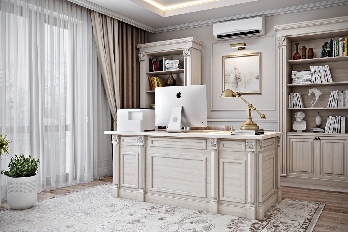 O neoclassicismo se manifesta no design das paredes. As paredes são divididas em partes superior e inferior para criar um ambiente rico. A transição entre eles é denotada por uma fita de papel de parede com tom de café: