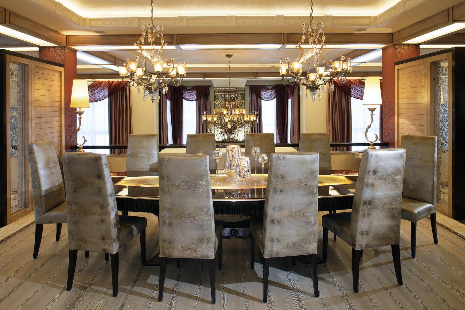 - Escolha uma tabela com uma forma geométrica: quadrado, retângulo ou círculo. Perto dele colocou as cadeiras de costas altas. O estofamento das cadeiras repete exatamente o material e o padrão das cortinas.