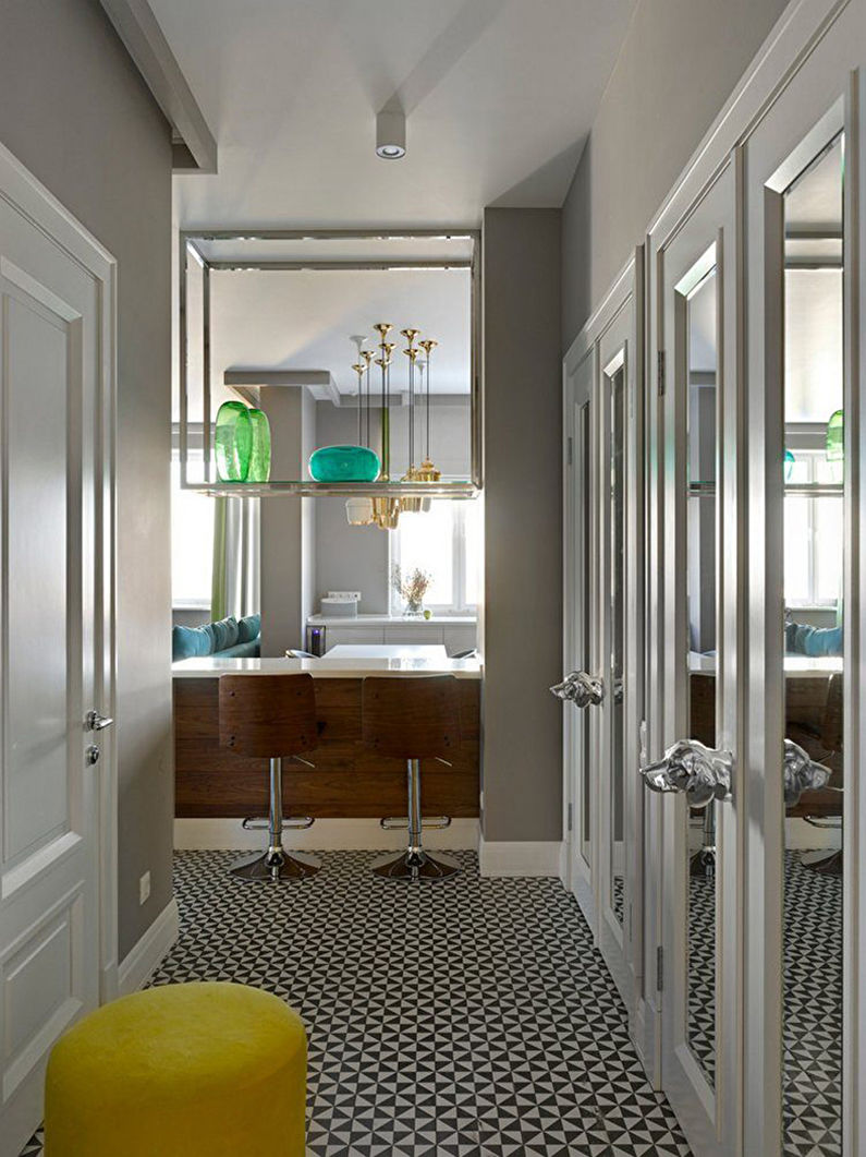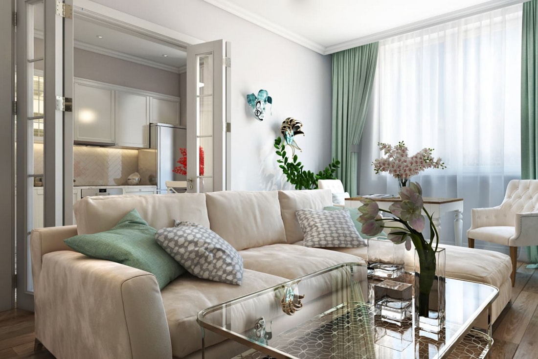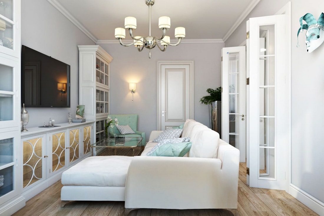 - Escolha um modelo de cores pastel para expandir visualmente o espaço. Se as portas monocromáticas parecerem chatas, o interior neoclássico permite que você use a transição do tom claro para o escuro na parte inferior da tela.