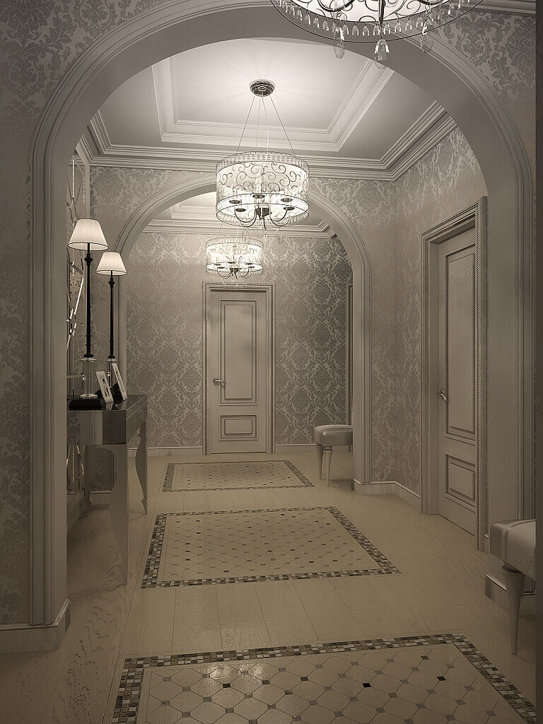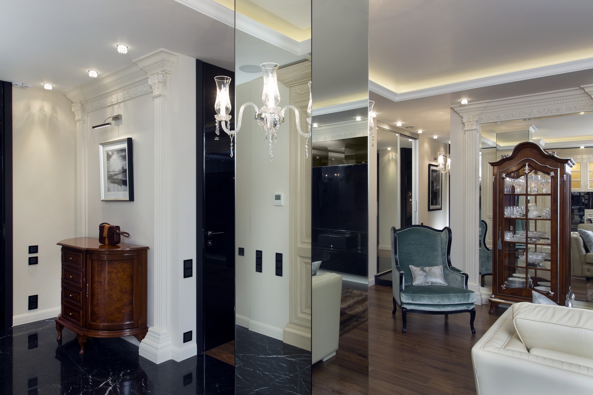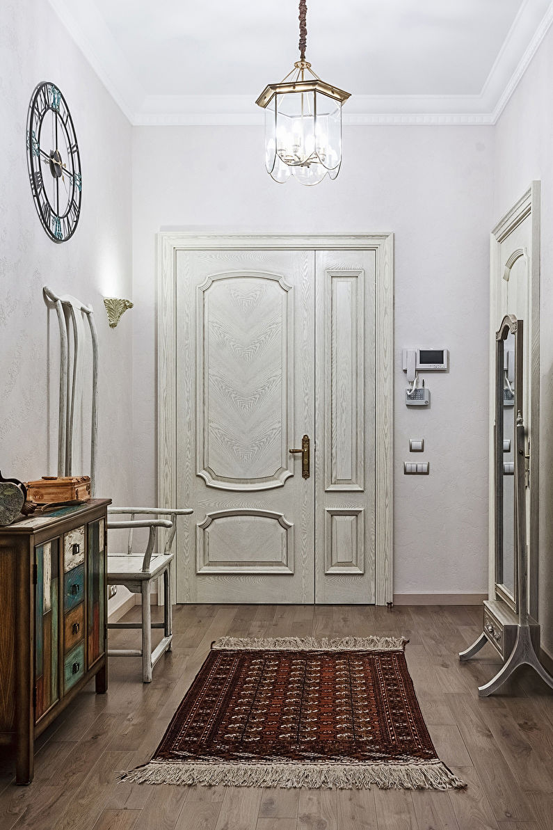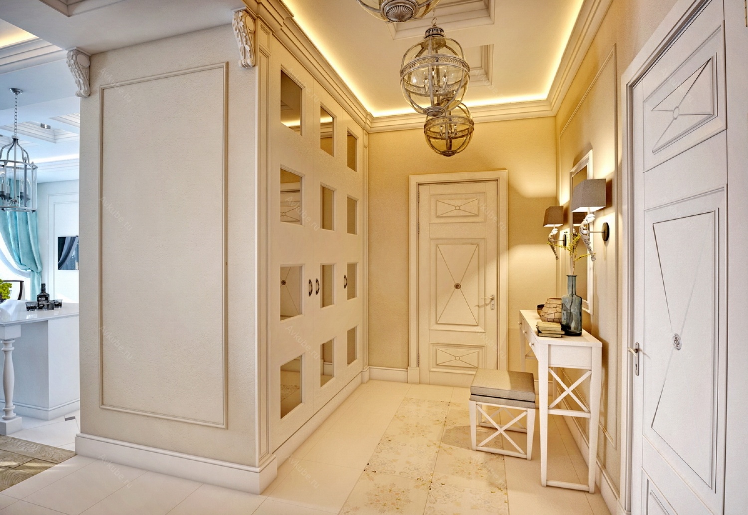 Portas entre salas podem ser perdidas entre o cenário neoclássico aristocrático. Combinação vantajosa com o mobiliário de uma paleta suave, lâmpadas simples e paredes claras.