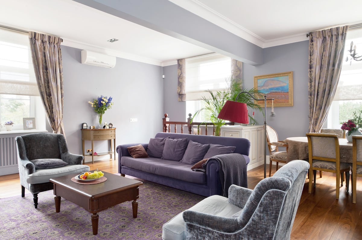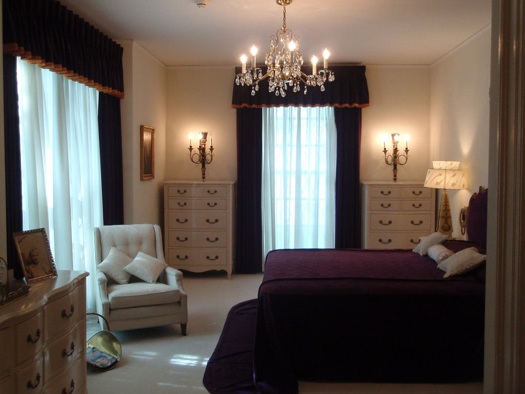 - Aberturas de janela grandes são cobertas com cortinas caras com lambrequins.