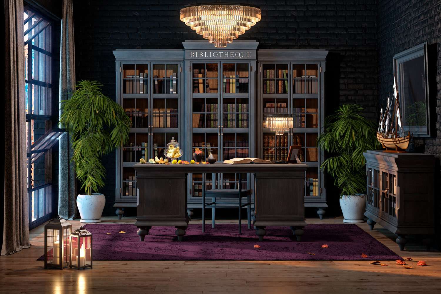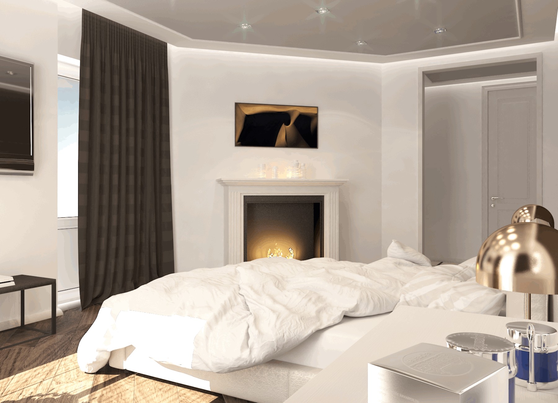 Os homens vão adorar o mármore lareira e o secretário aristocrático mantendo a documentação de trabalho. Fascine com luz suave as velas em castiçais forjados, eles ecoam a parede luminárias.