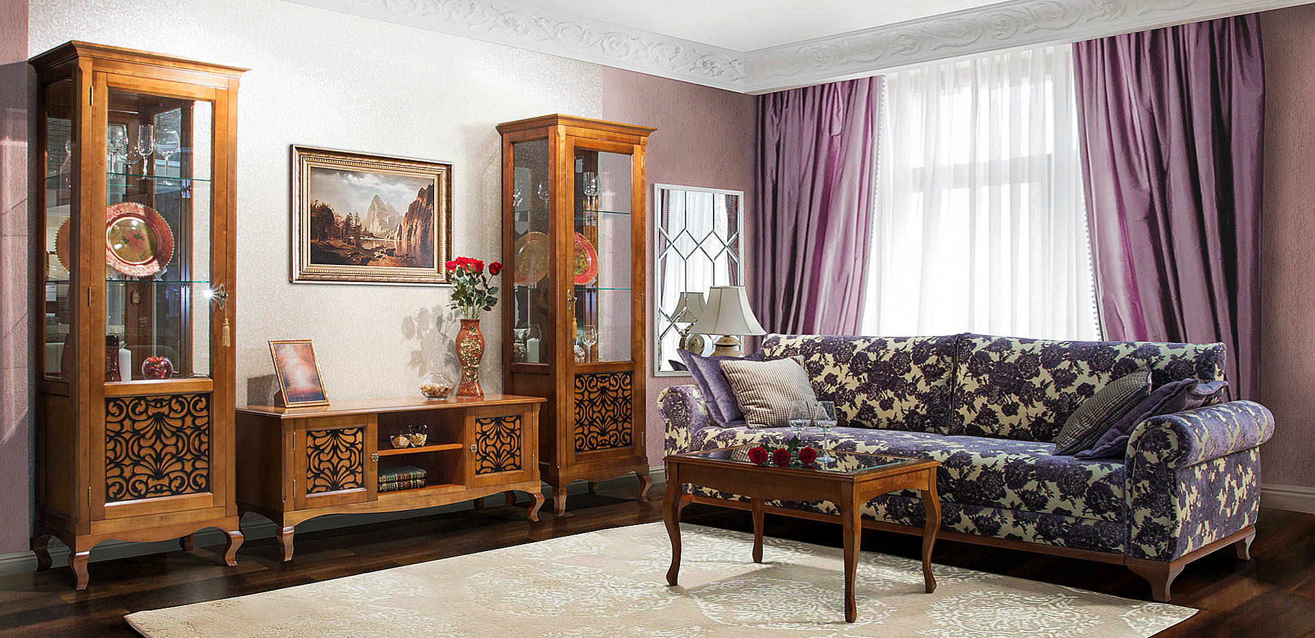 - Caro conjunto de valiosas variedades de madeira. A composição maciça de móveis substitui com sucesso vários gabinetes altos, pintados em cores pastel. Fachadas e armários de vidro são necessários para organizar conjuntos de porcelana pintados. Conjuntos de móveis em cores devem se sobrepor à cor principal da sala, brincar com contraste é inadequado aqui.