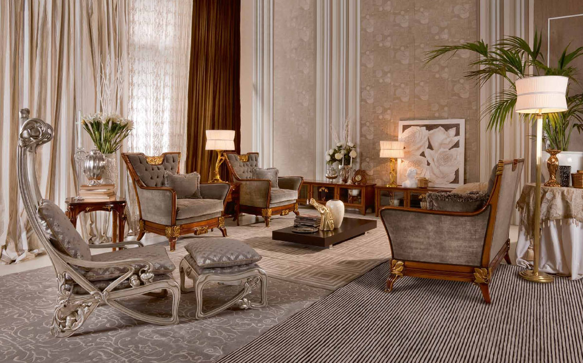 - A parte central da composição é o tapete persa. Perto dele tem duas cadeiras e uma cadeira. Parece interessante baixo sofá com um padrão intrincado de folhas, café ou mesa de café. No final, nas laterais expõem as mesas de cabeceira duplas.