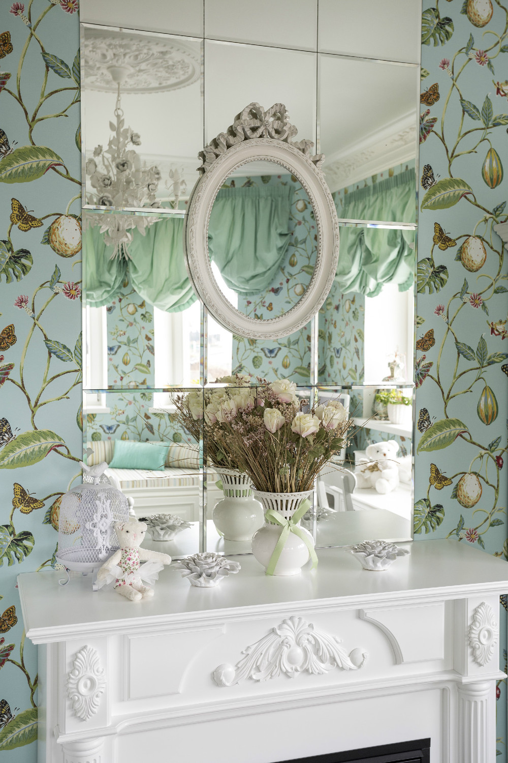 - Para decorar as seções inferiores, eles usam papel de parede de tons suaves com motivos florais. Painéis de madeira ou gesso também podem ser paredes sombreadas.