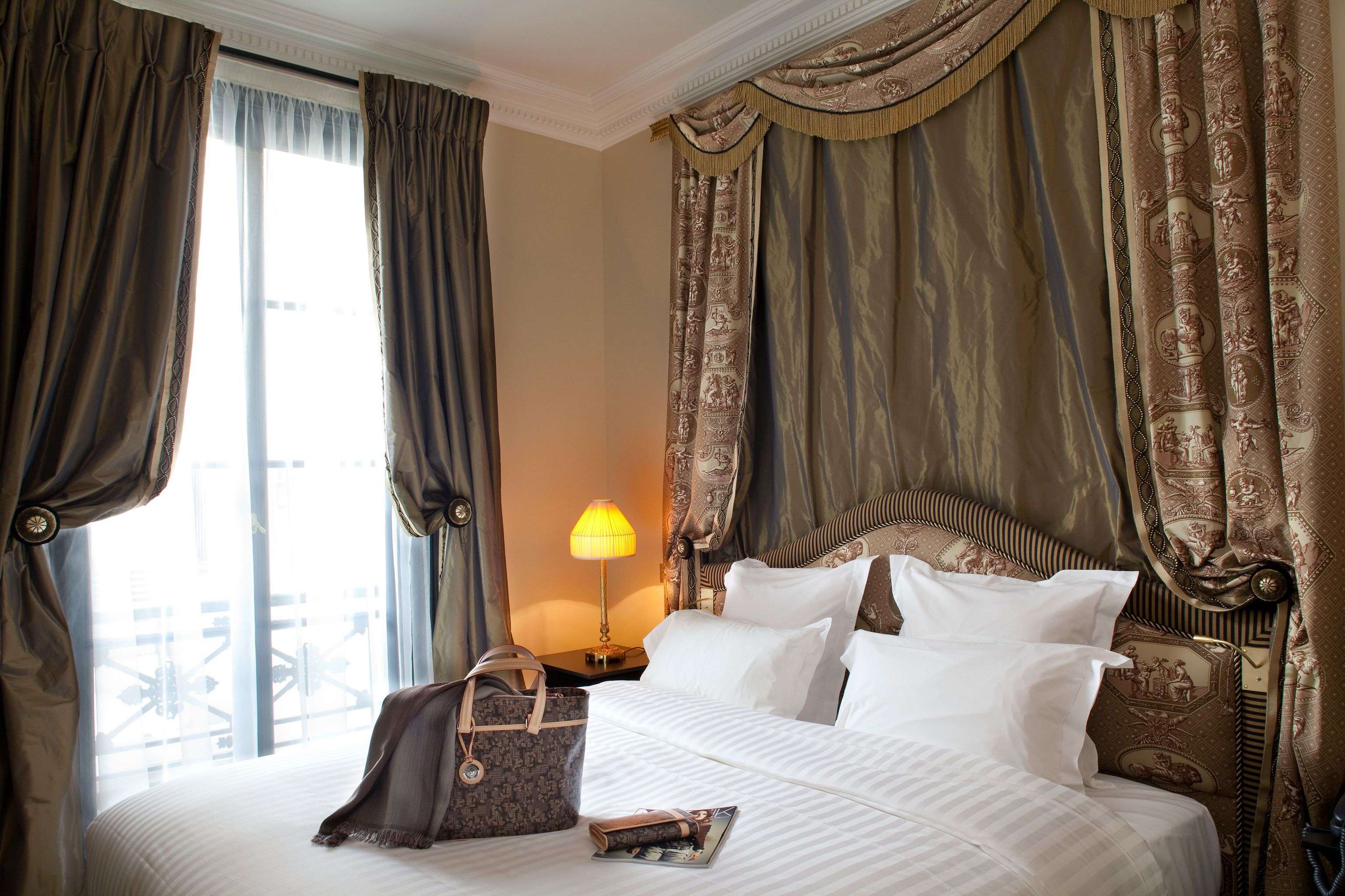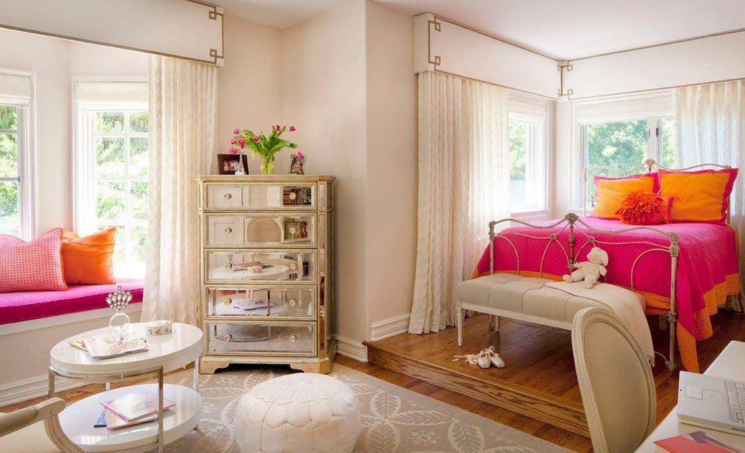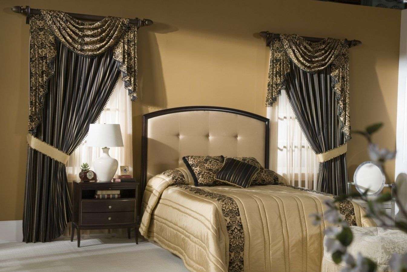 Para obter uma aparência elegante das janelas, geralmente é necessária uma escolha cuidadosa do tecido. Tons românticos e cortinas são irrelevantes aqui. A chave é a suavidade, a presença de camadas e dobras profundas decadentes. Portiere de grandes dimensões, que pende do chão até o teto, é especialmente elegante porque torna seu quarto visualmente mais alto e aumenta a distância até o teto.
