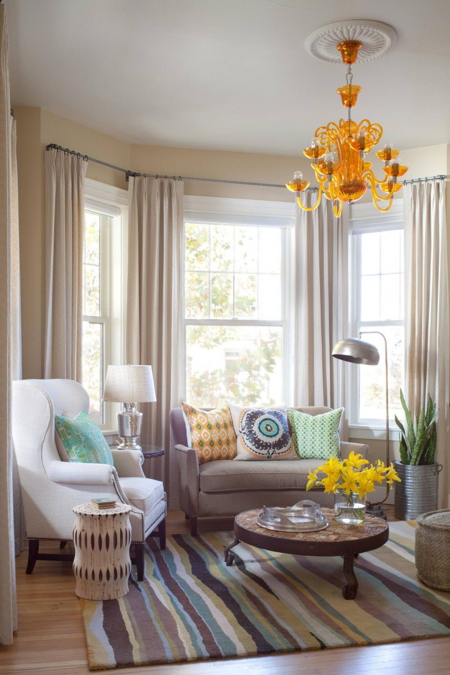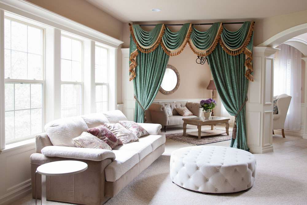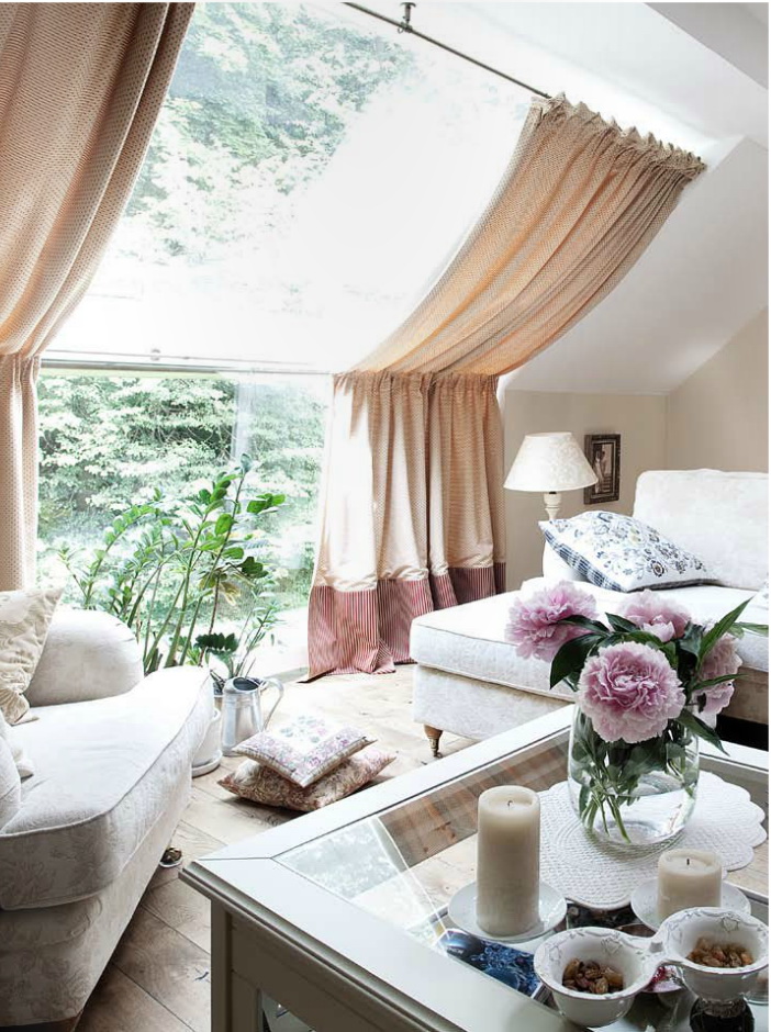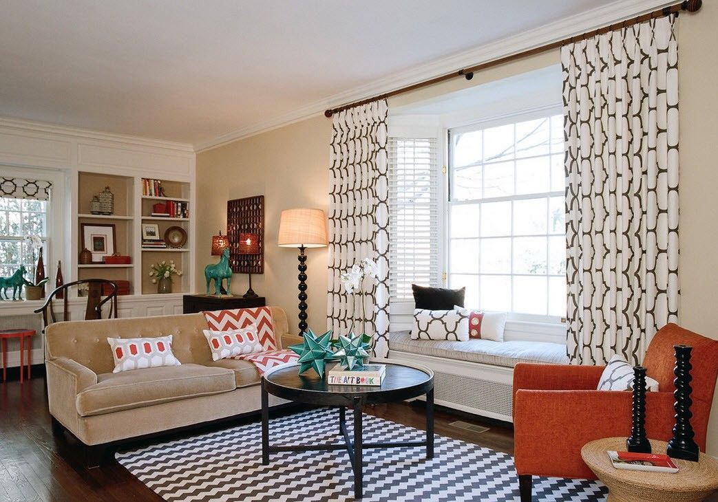 Em janelas altas, ou aquelas que você quer fazer altas, escolha qualquer tule, e então aplique cortinas longas para dar expressividade e uma aparência finalizada. Adicione valência para obter a "wow-window". Permita-se em sua sala experimentar padrões ousados, misturar e combinar tecidos. Afinal de contas, a coisa principal para uma propriedade de sala de estar é fazer você sentir que você quer viver nisto!