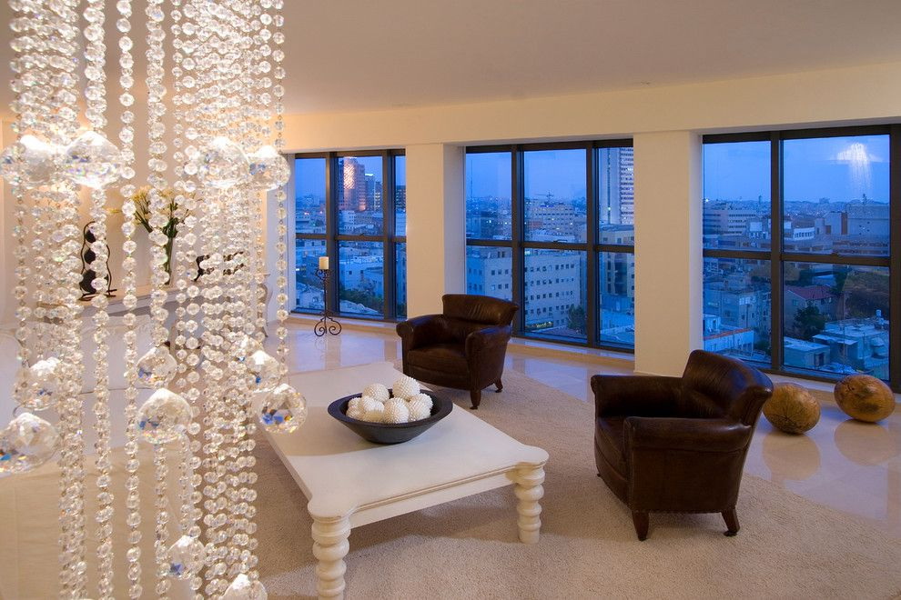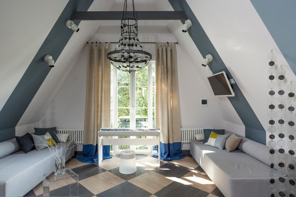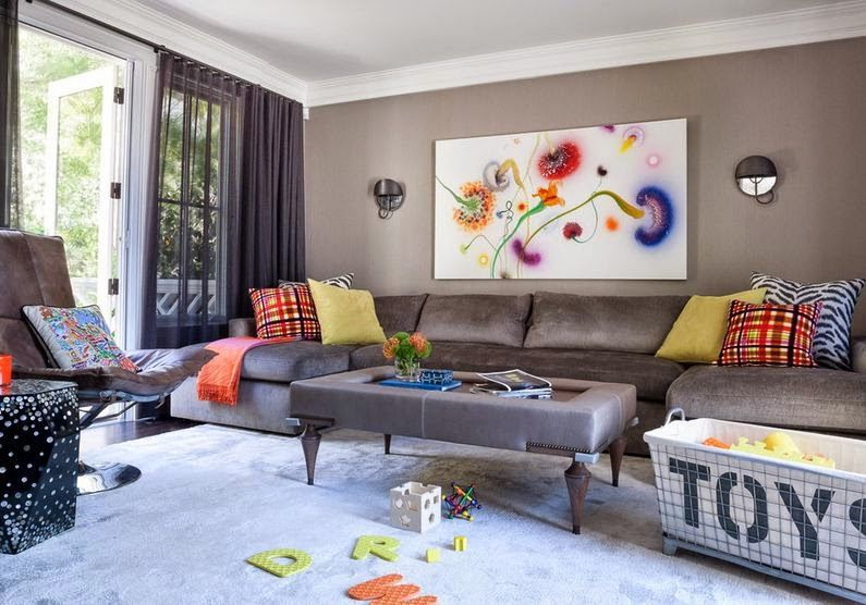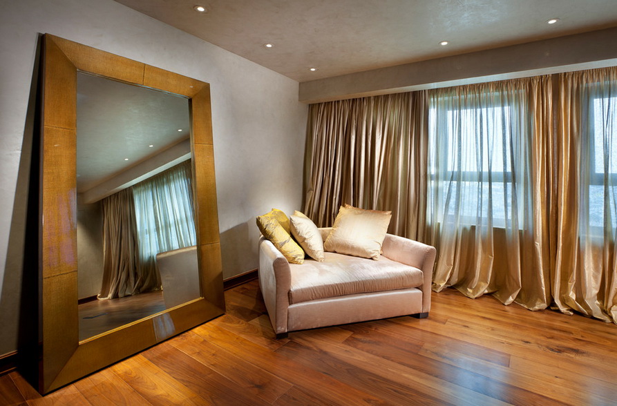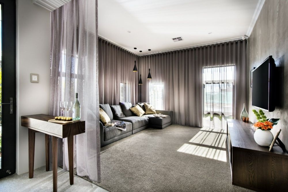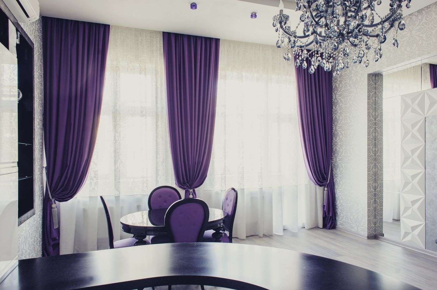 Em janelas altas, ou aquelas que você quer fazer altas, escolha qualquer tule, e então aplique cortinas longas para dar expressividade e uma aparência finalizada. Adicione valência para obter a "wow-window". Permita-se em sua sala experimentar padrões ousados, misturar e combinar tecidos. Afinal de contas, a coisa principal para uma propriedade de sala de estar é fazer você sentir que você quer viver nisto!
