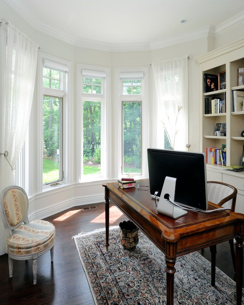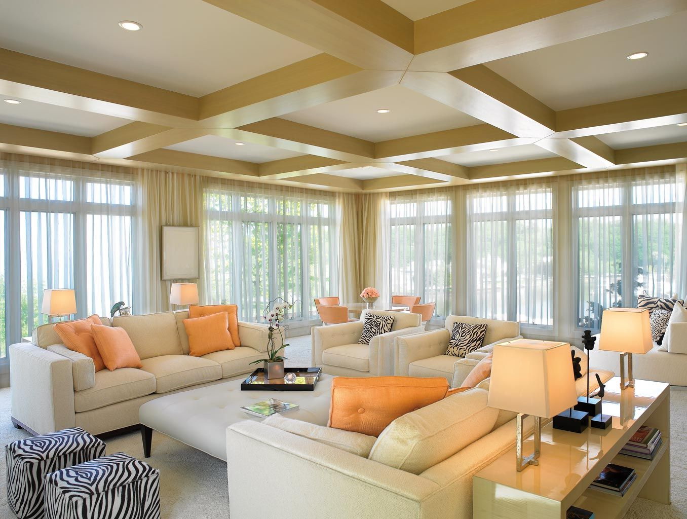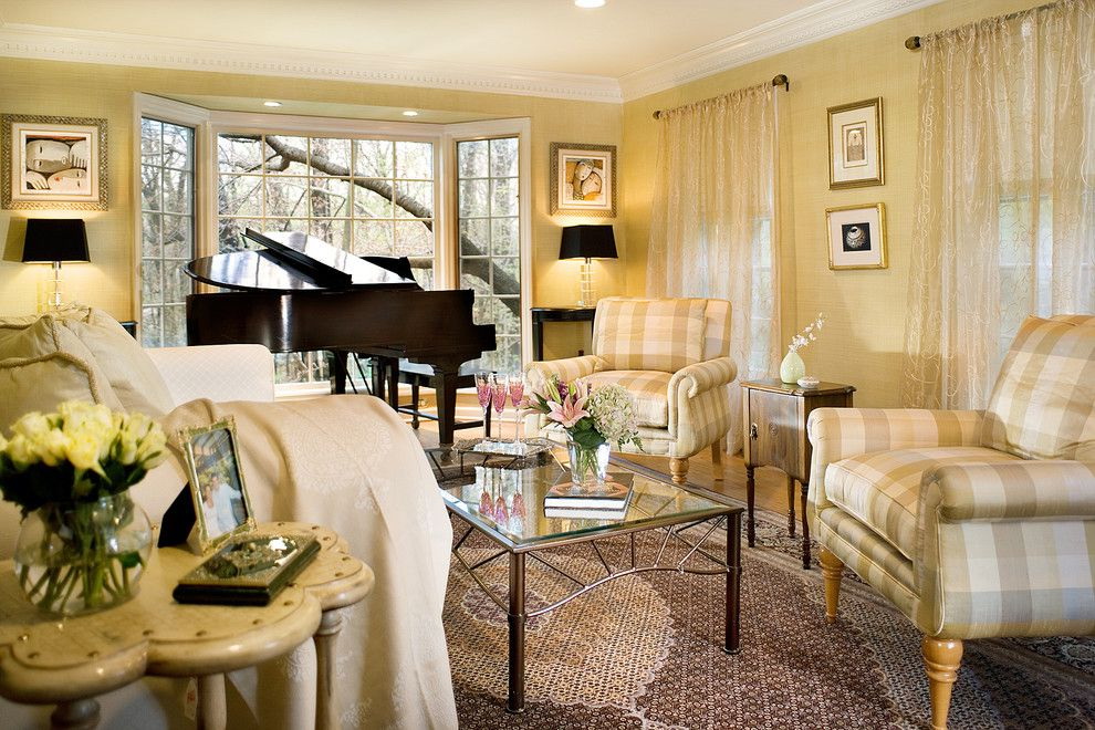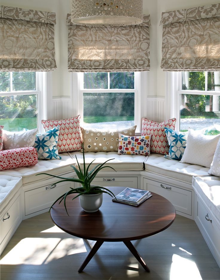 Aqui você vai fazer uma declaração sobre sua casa, entreter e proteger móveis grandes que você não quer estragar. Tons solares ou de mel são excelentes protetores da luz solar direta, além disso, eles permitem que você ajuste a quantidade de luz e crie uma aparência acolhedora. As janelas romanas ficam ótimas em amplas janelas salientes - suaves e elegantes.