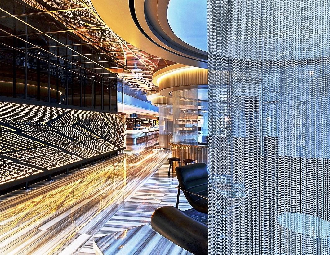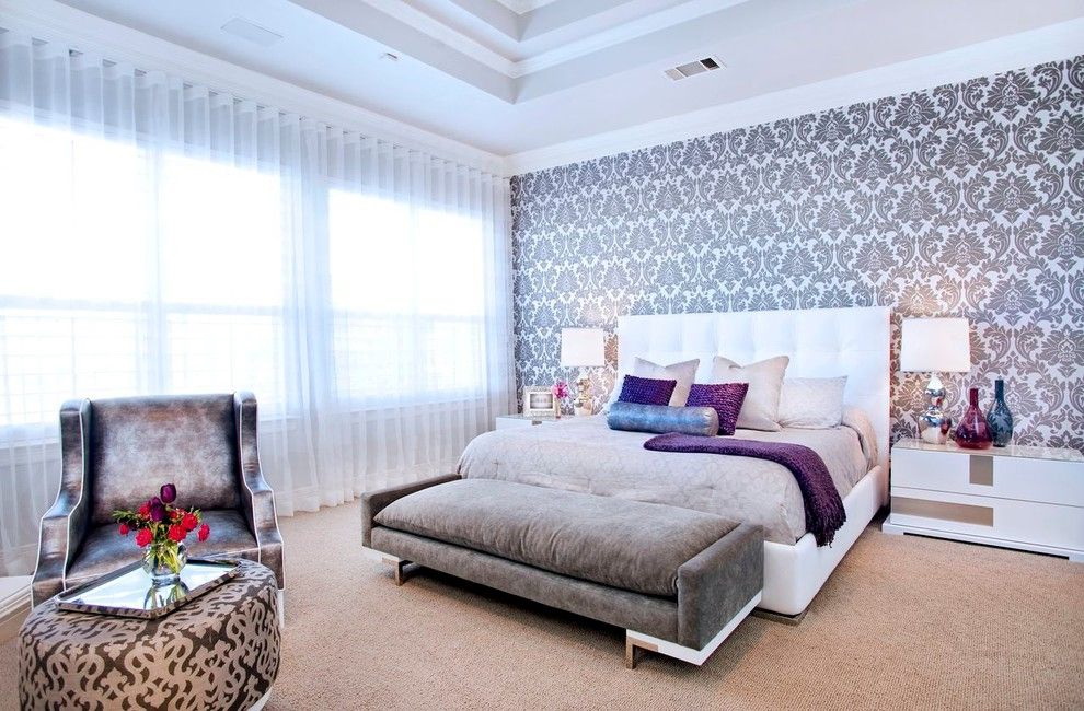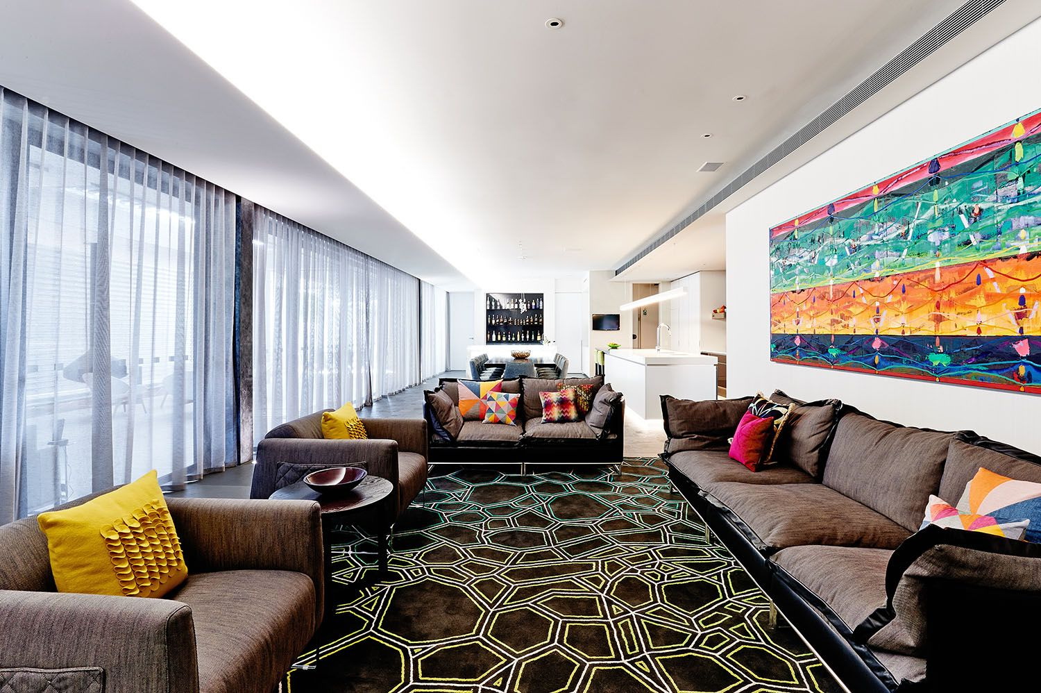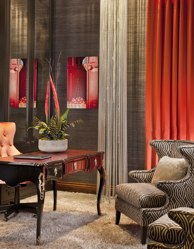 Para um foco dramático, ao trabalhar com padrões geométricos ou gráficos superdimensionados em qualquer sombra, eu prefiro o romano, se eu quiser que o tecido seja sentido no espaço. Escolha equipamentos de aço, cromo ou níquel, e forneça um visual moderno e minimalista, escolhendo cortinas ou persianas mecanizadas.