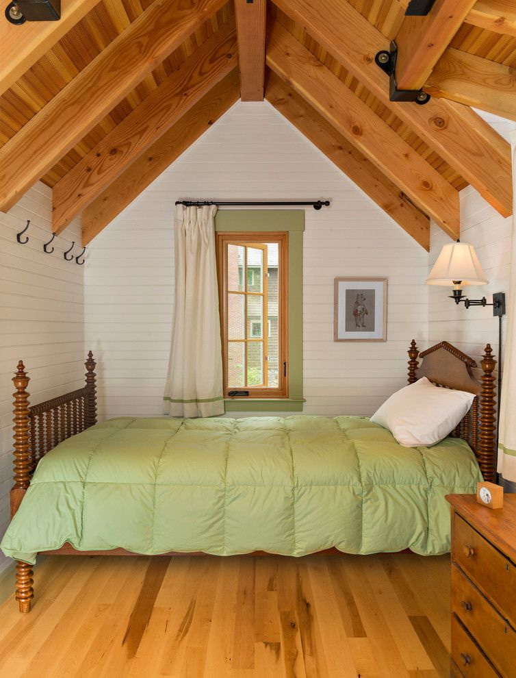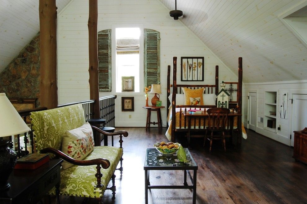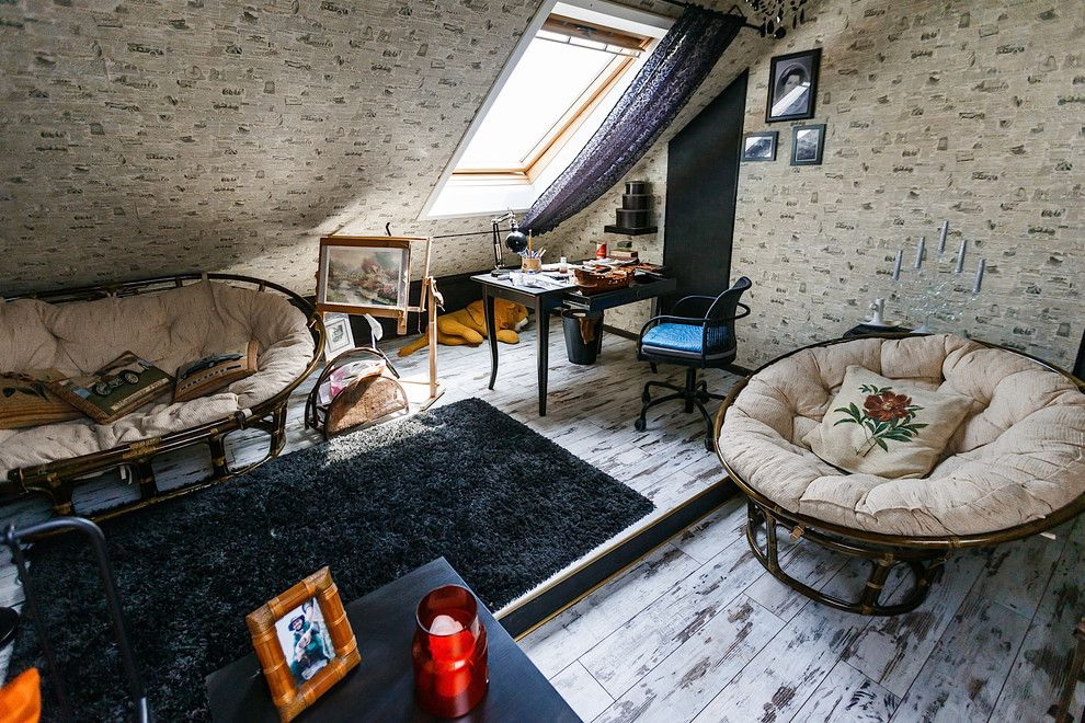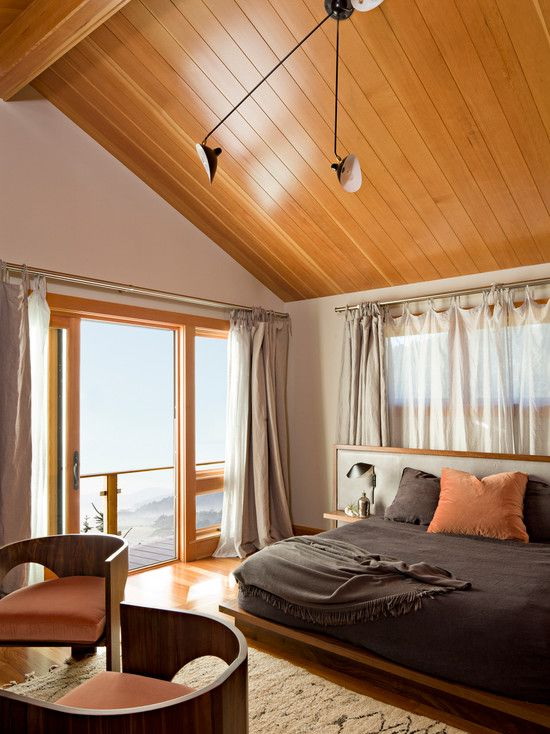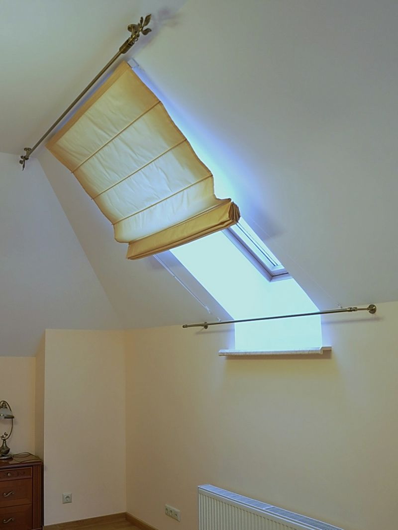 Pendurada no alto do teto e colocada perto das bordas externas da janela, a cortina pode tornar a sala e a janela maiores. Nesta forma, torna-se um companheiro ideal em combinação com outro tipo de caixilhos de janelas - coberturas tecidas para madeira ou cortinas de madeira clássicas.