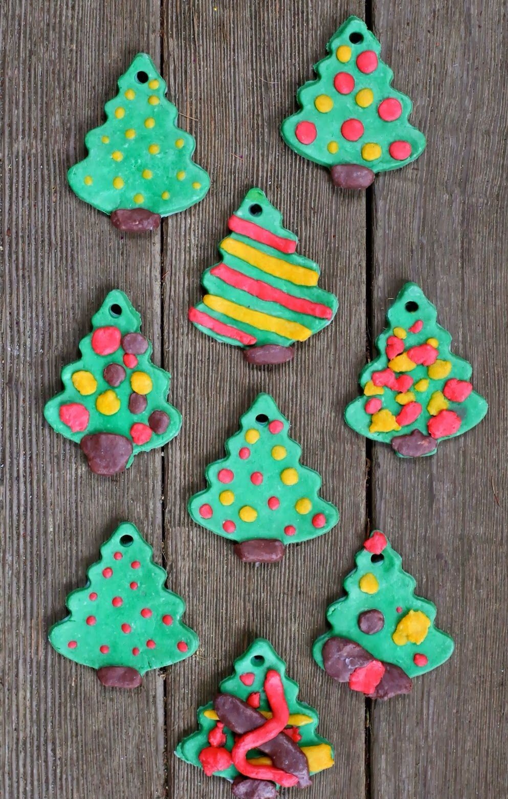- Faça árvores de Natal em forma plana. Para fazer isso, basta cortá-los da massa com uma faca de brinquedo e assar. Enquanto a massa é macia, você pode fazer belos padrões nela.