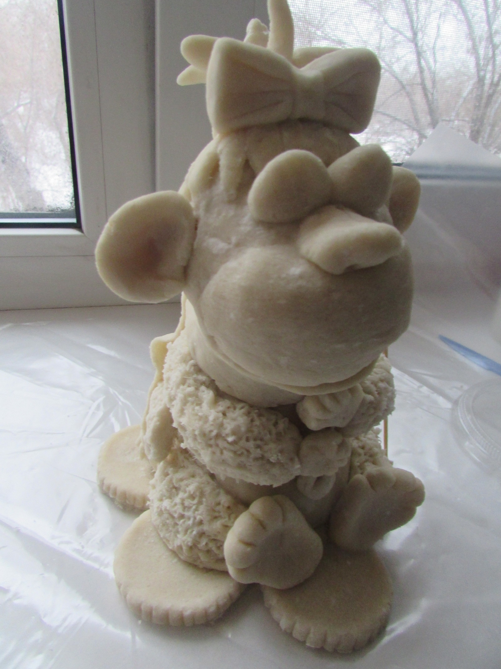 - Drop. Também é fácil - você precisa cortar uma gota da massa e, em seguida, uma faixa larga, cuja borda é cortada em tiras transversais e mais estreita e anexar à queda. Então, resta curvar levemente as tiras estreitas, colocar um círculo de nariz e bigode ligeiramente enrolado em cima delas e colocar tudo no forno. E depois - pintar de branco, vermelho e cor de carne.