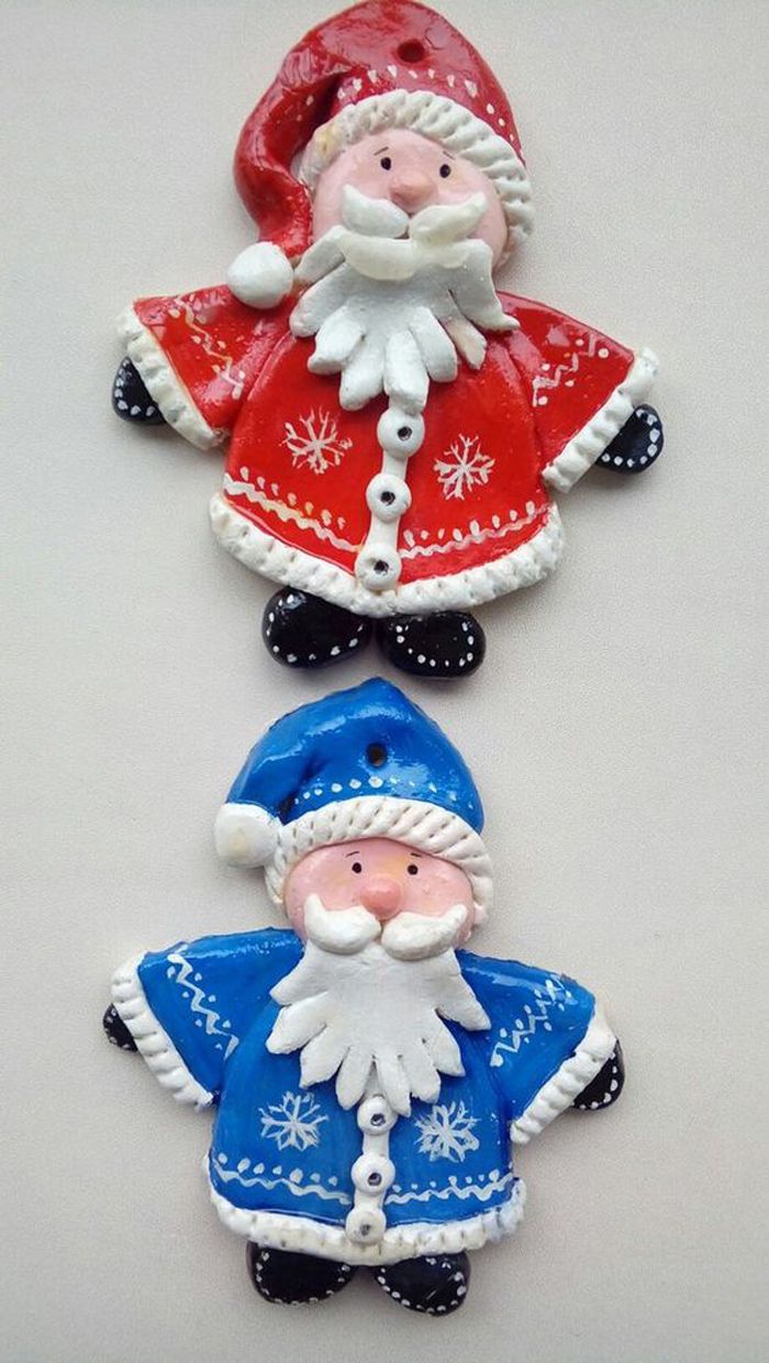 A Donzela da Neve precisa de uma trança de flagelos de tecido, e Papai Noel tem uma barba enrolada nas extremidades e tem um bigode. Quando as figuras estiverem prontas, você poderá assá-las e adicionar acessórios. Você pode fazer uma sacola para o Papai Noel - é melhor costurar, mas também pode ser feita a partir de uma massa - e um bastão longo de folha de prata. Snow Maiden não tem tais objetos reconhecíveis, mas você pode dar a ela um coelho feito de algodão, por exemplo, ou uma grande estrela feita de papel alumínio.