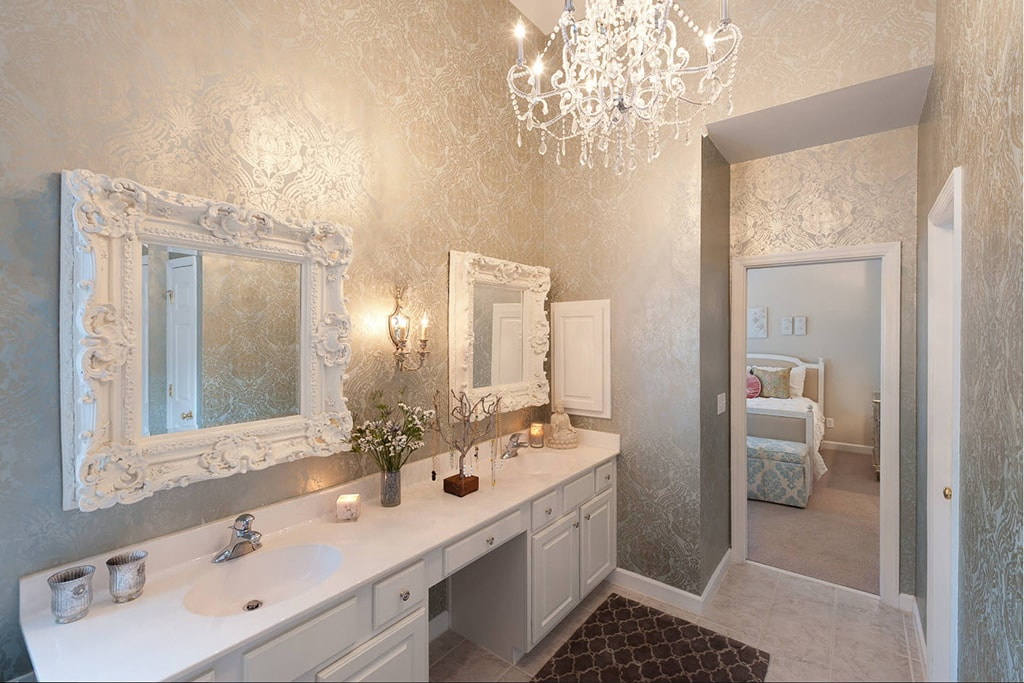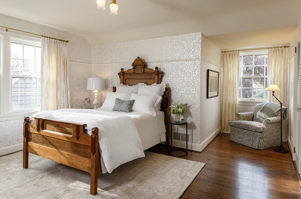 Esta sala na casa é geralmente feita com base em seus próprios desejos. Não leva convidados, visitantes, exceto os proprietários, quase nunca acontece. Portanto, ao escolher papel de parede com serigrafia para esta sala, você pode dar rédea solta à fantasia. O material implica imitação de seda, tecido, o que dá ao ambiente uma atmosfera especial.