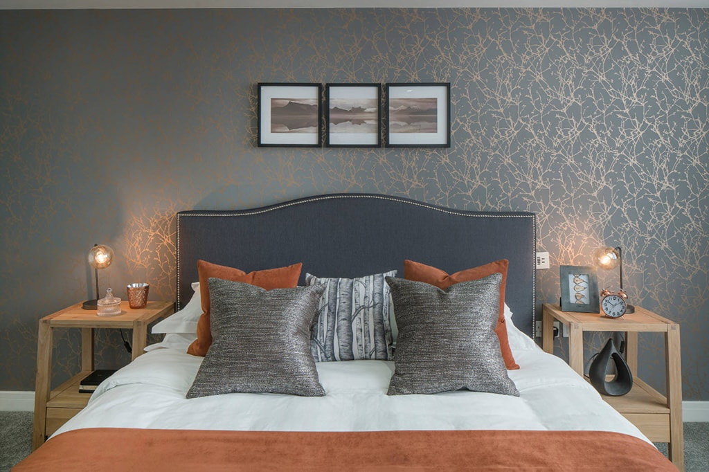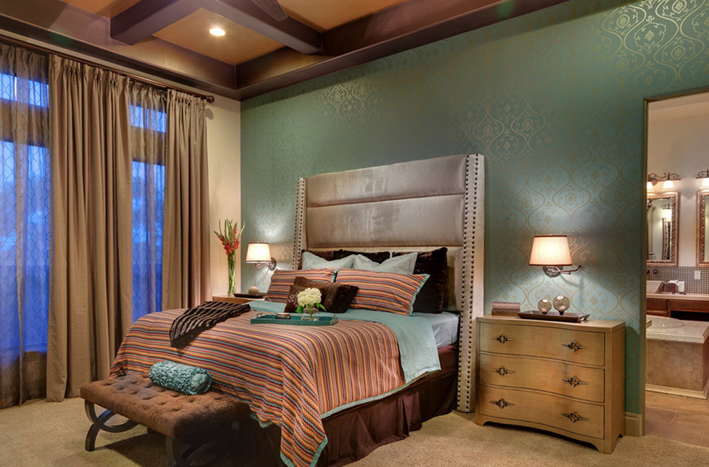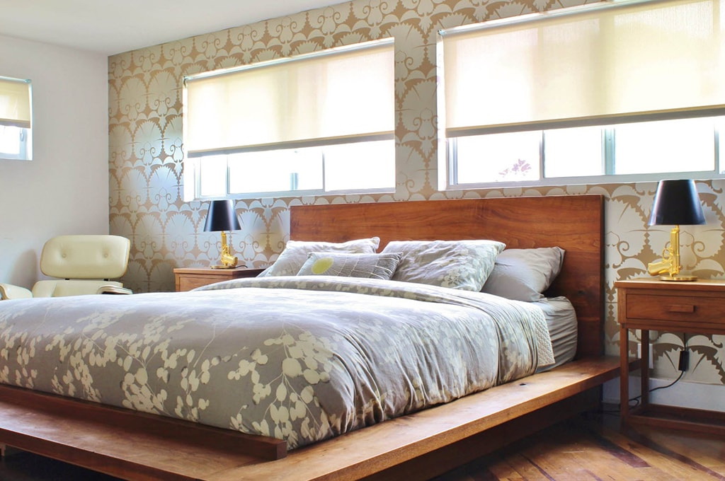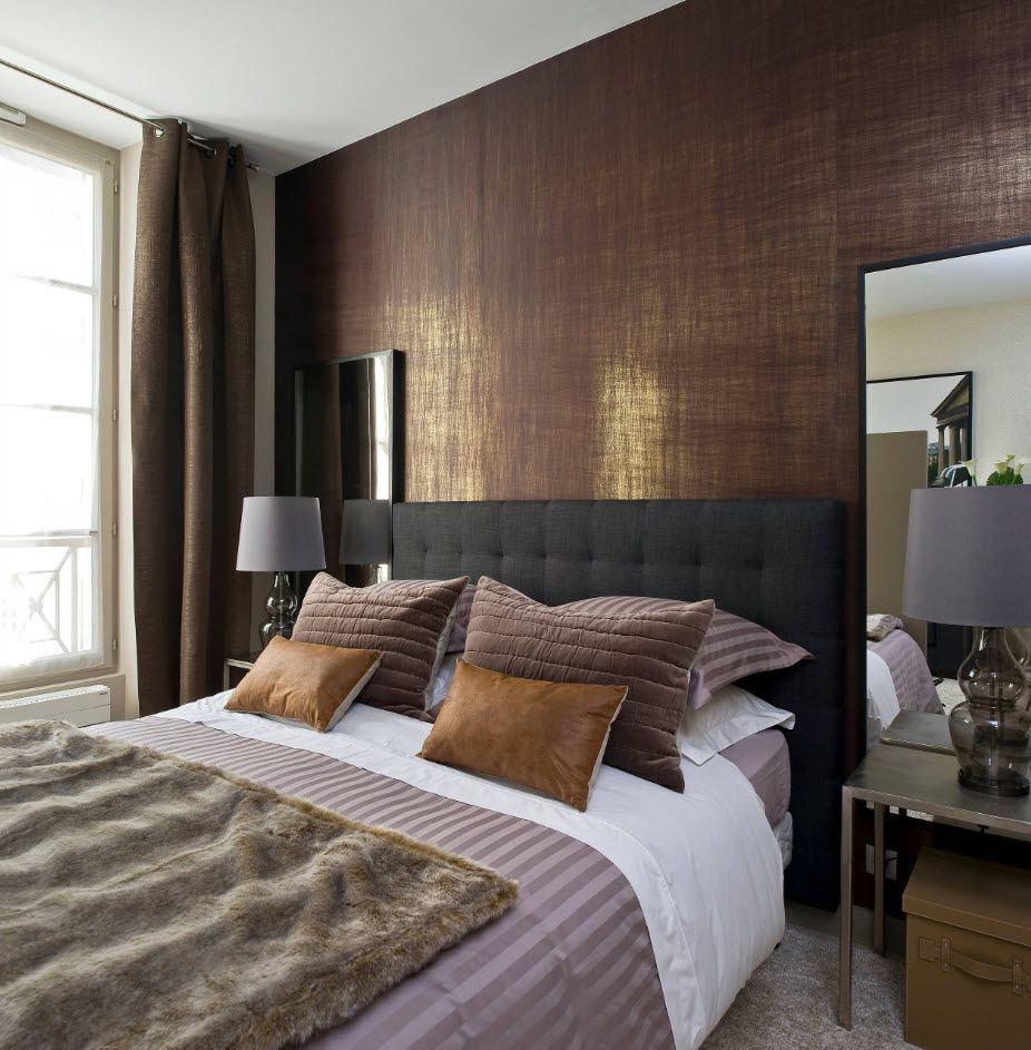 O principal atributo do quarto é uma cama, por isso, ao escolher qualquer parte do design da sala, você precisa levar em conta as características do modelo escolhido. Se é com uma parte traseira macia, bem, se o papel de parede é combinado com isto, resulta uma combinação boa.
