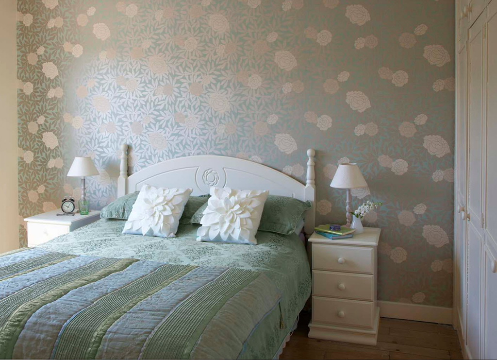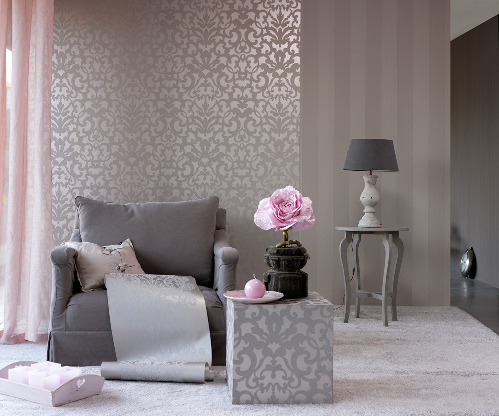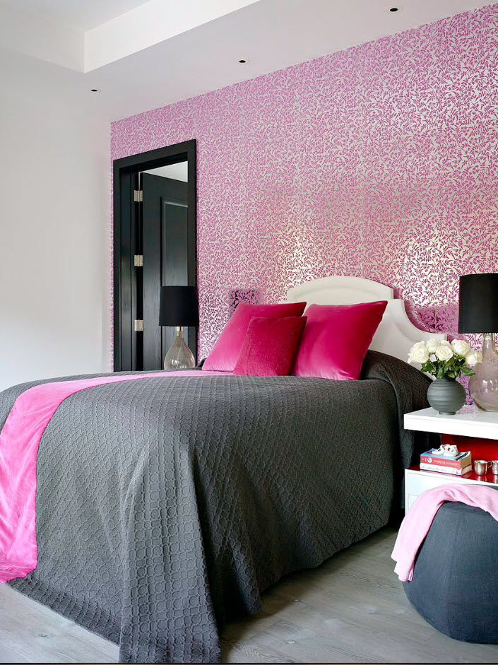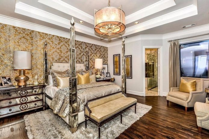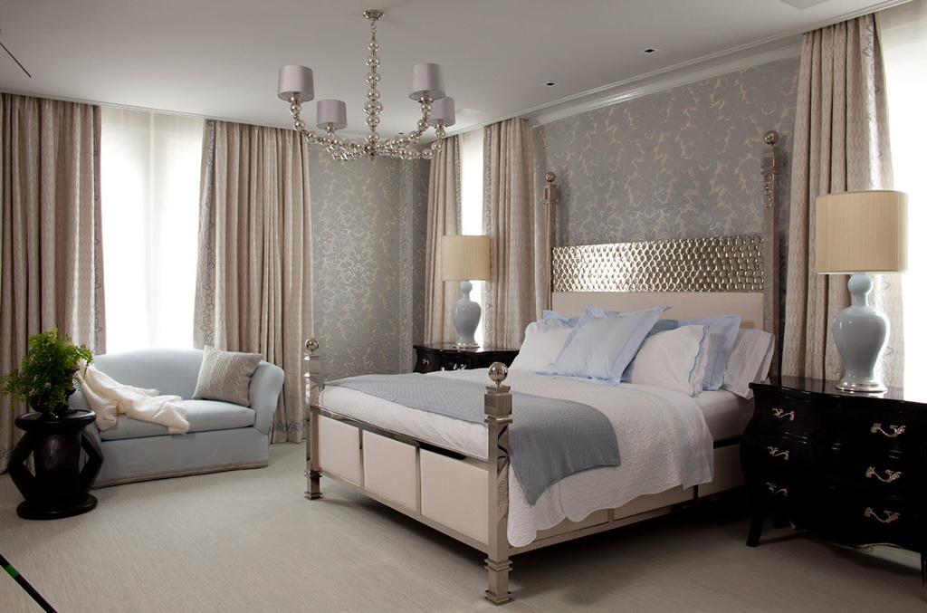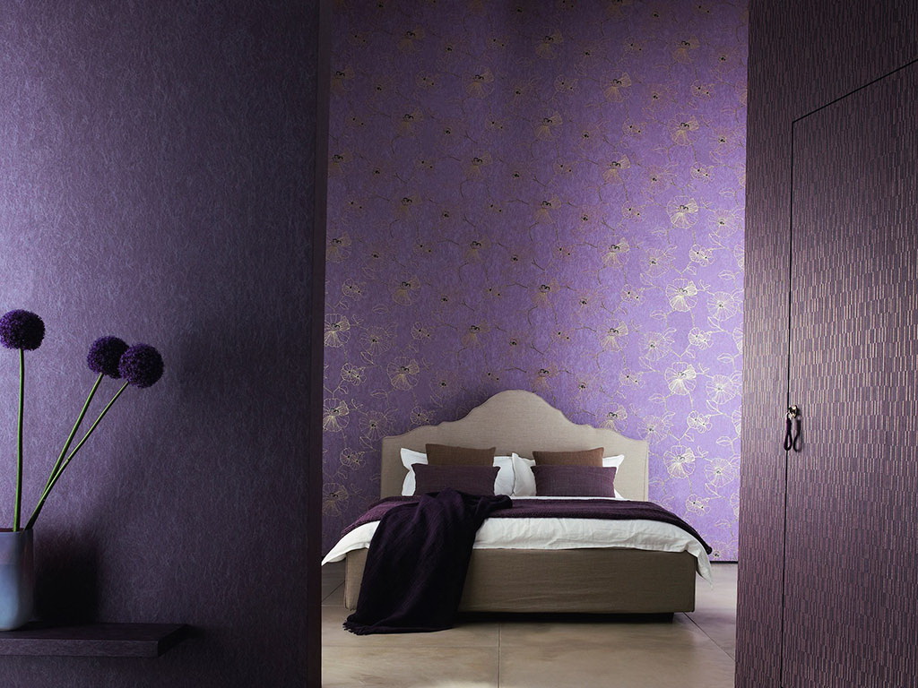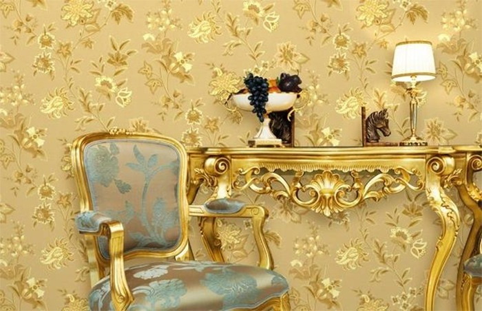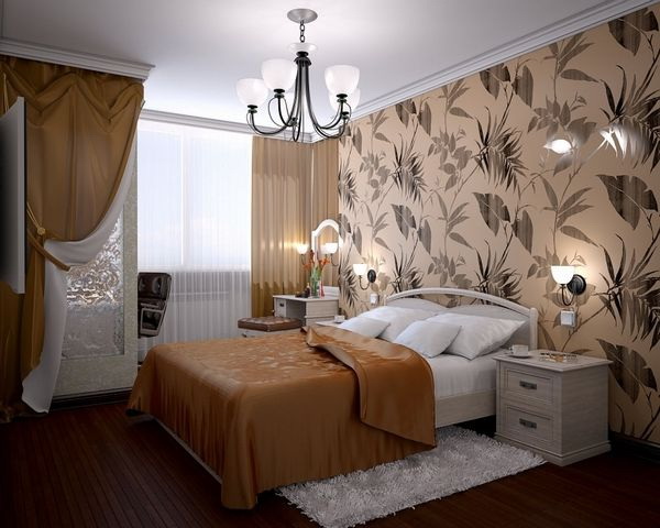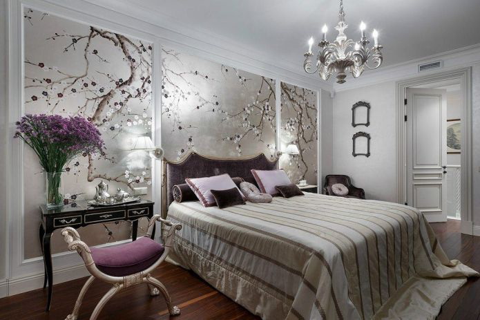 A espessura, densidade do papel de parede selecionado não importa muito, um papel fundamental no design desta parte da casa é desempenhado pela estética, beleza. A serigrafia é agradável ao toque, combinada com roupa de cama de cetim e seda. O brilho característico é perceptível na fraca luz noturna da lâmpada.