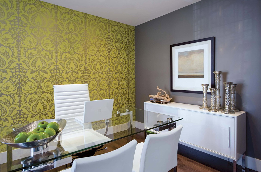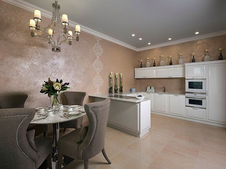 Alguns decidem usar material de vinil de tela de seda para apenas uma parede na cozinha. Isto aplica-se aos quartos de tamanho pequeno, geralmente a parede é escolhida a que eles se sentam durante uma refeição. Se a cozinha é grande, dividida em zonas para cozinhar e relaxar, então é melhor usar esses papéis de parede no segundo.