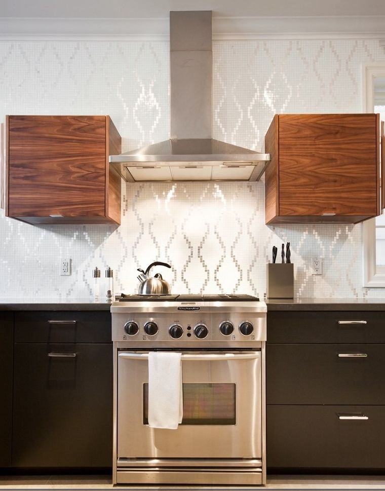 Para o design da cozinha é melhor escolher as opções brilhantes que toleram melhor a lavagem. Seu brilho permanecerá por anos, mesmo que às vezes esfregando vocêektkoy