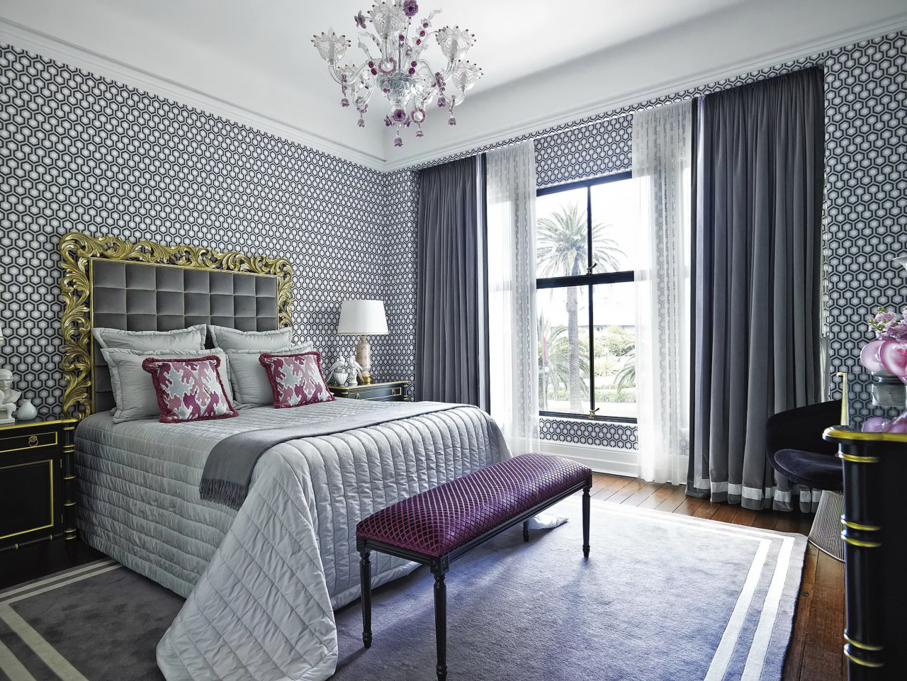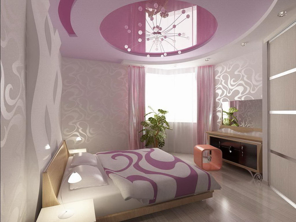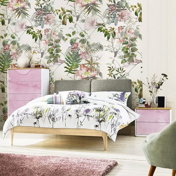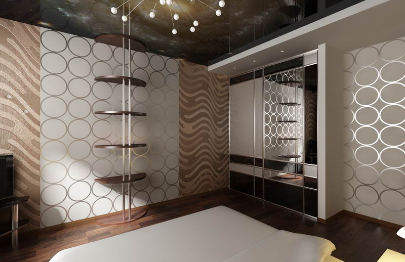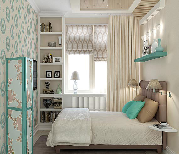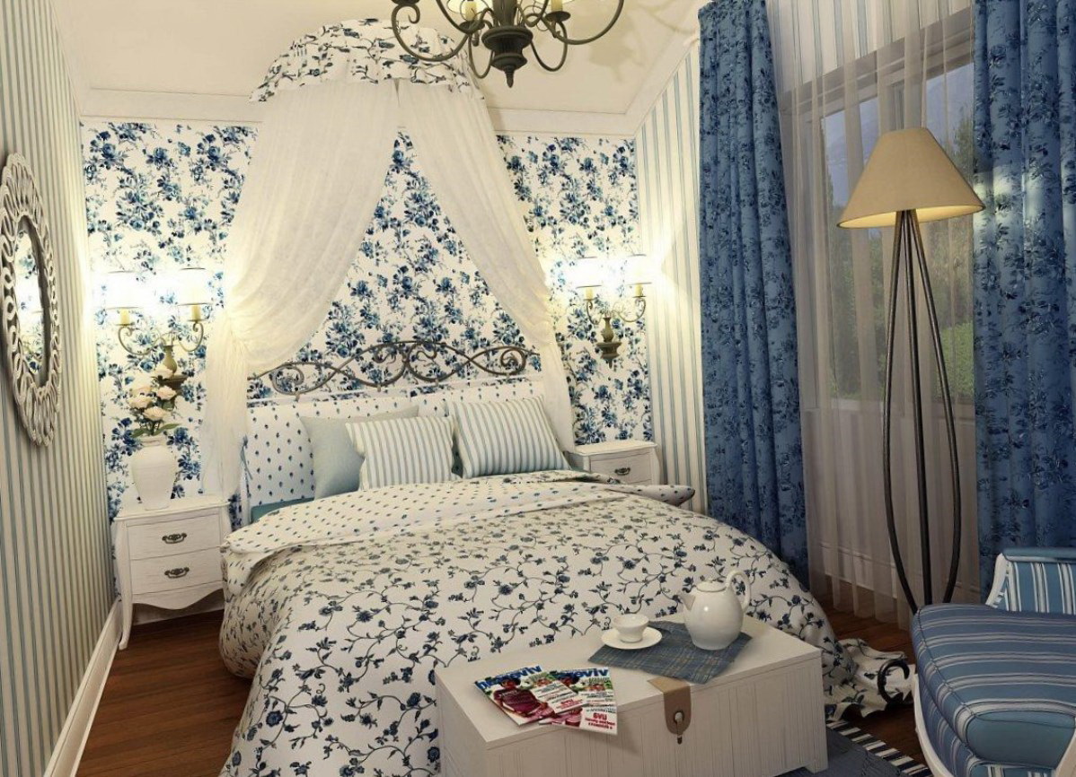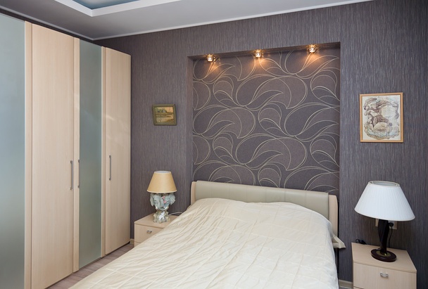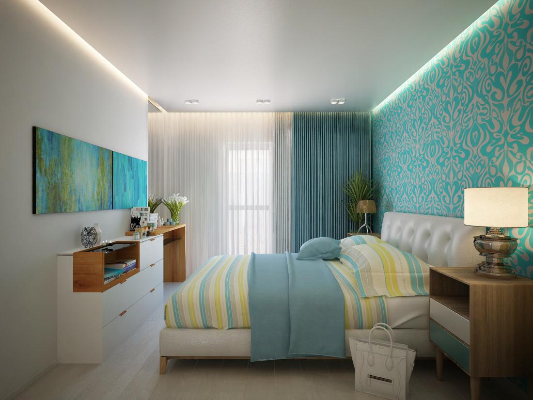 O quarto é um lugar para dormir e relaxar, então seu interior é mais frequentemente projetado em uma gama calma. Para a decoração da sala, eles usam papel de parede com um padrão discreto em cores pastel ou combinam telas de cores simples com um acento brilhante em uma das paredes na forma de uma imagem ou um ponto colorido.