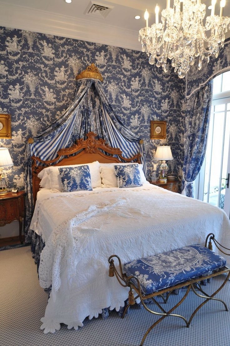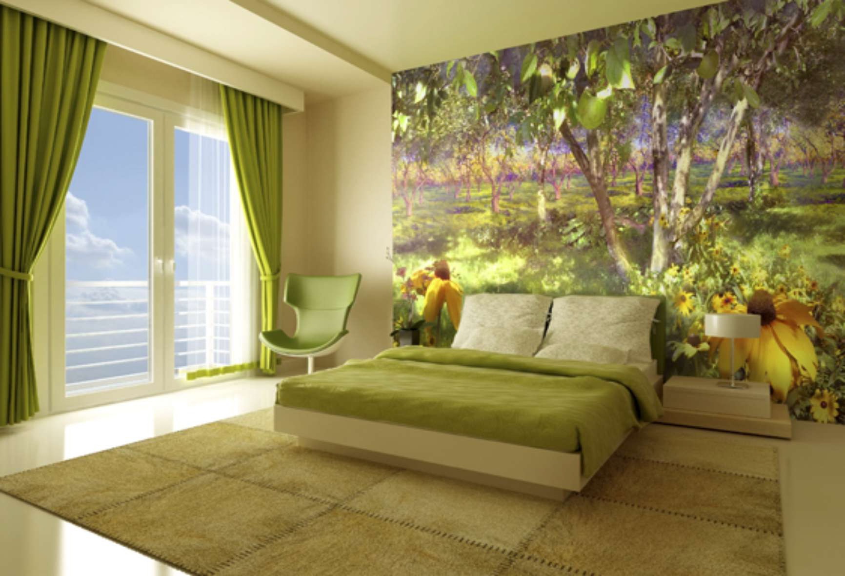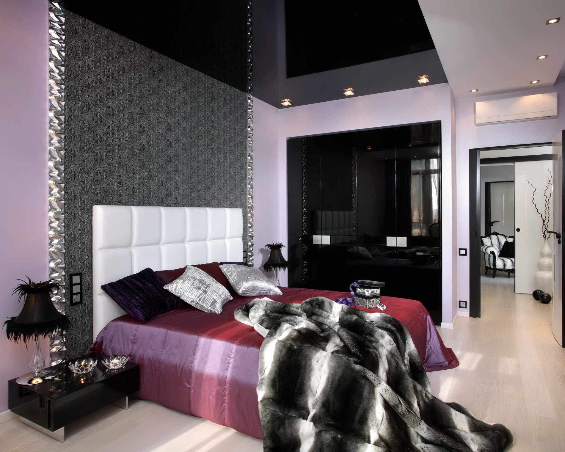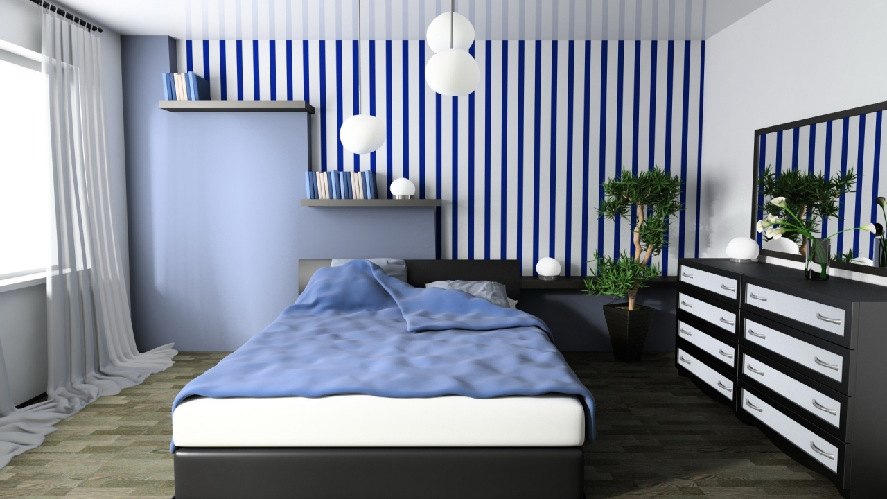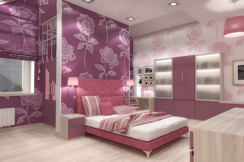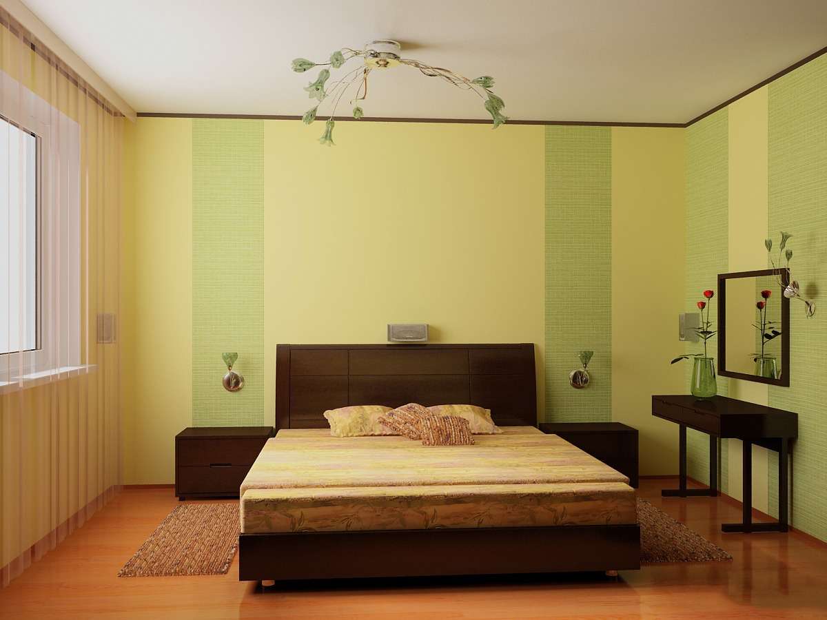 O quarto é um lugar para dormir e relaxar, então seu interior é mais frequentemente projetado em uma gama calma. Para a decoração da sala, eles usam papel de parede com um padrão discreto em cores pastel ou combinam telas de cores simples com um acento brilhante em uma das paredes na forma de uma imagem ou um ponto colorido.