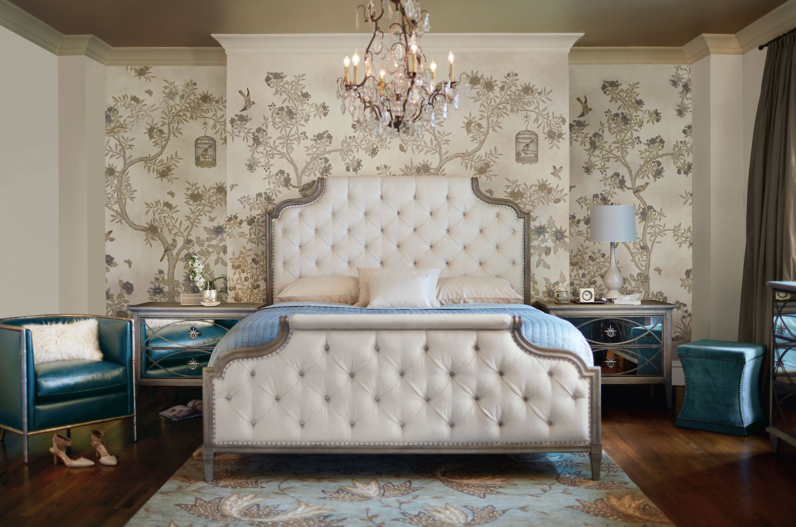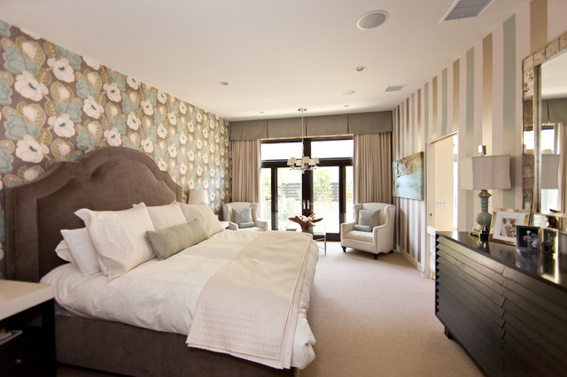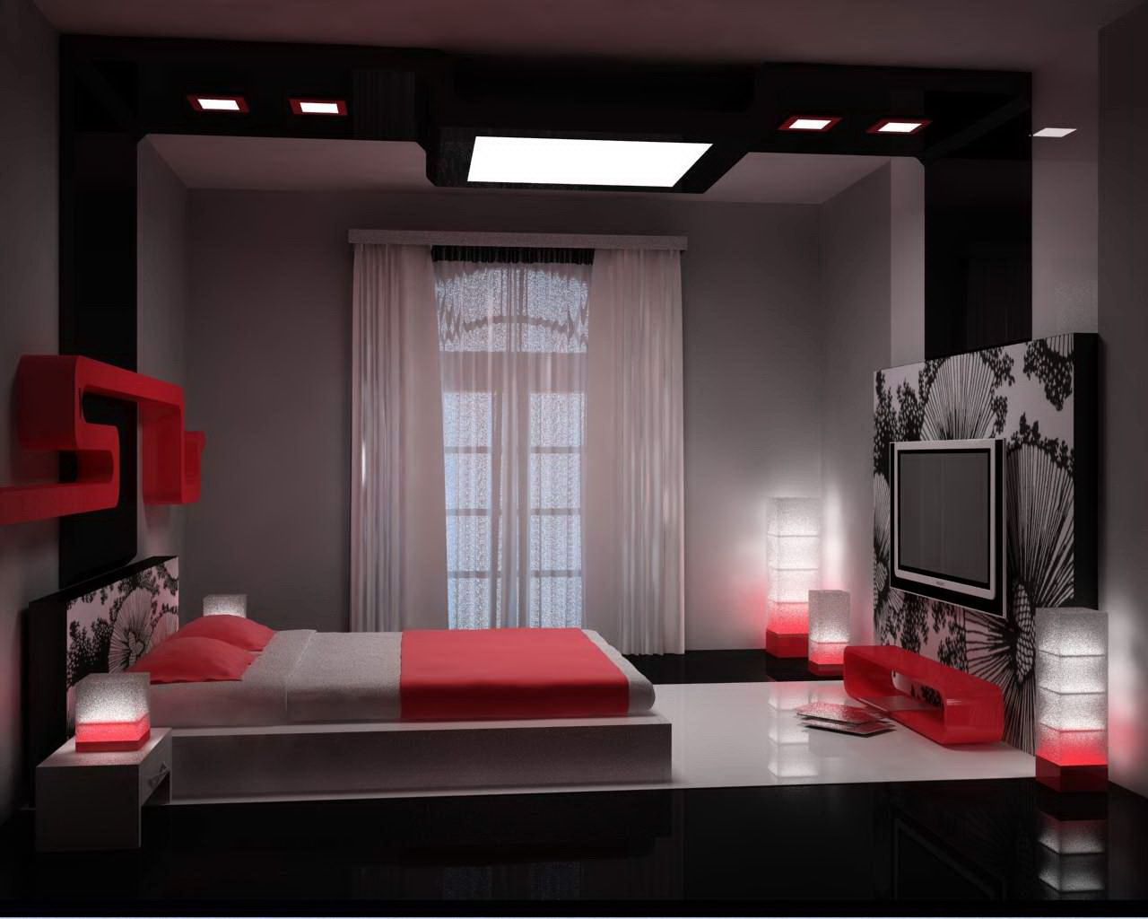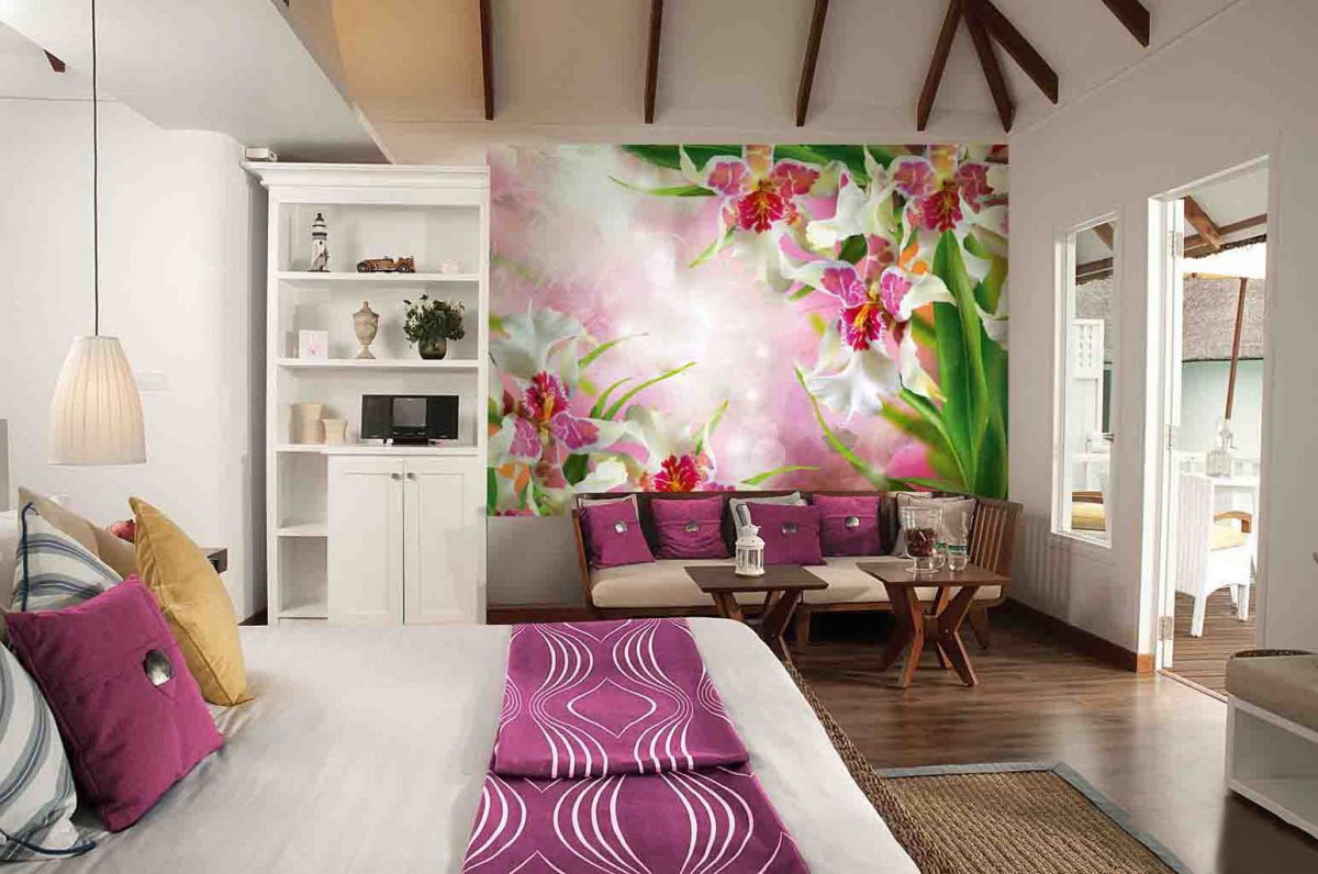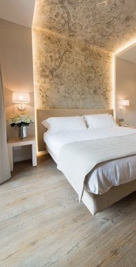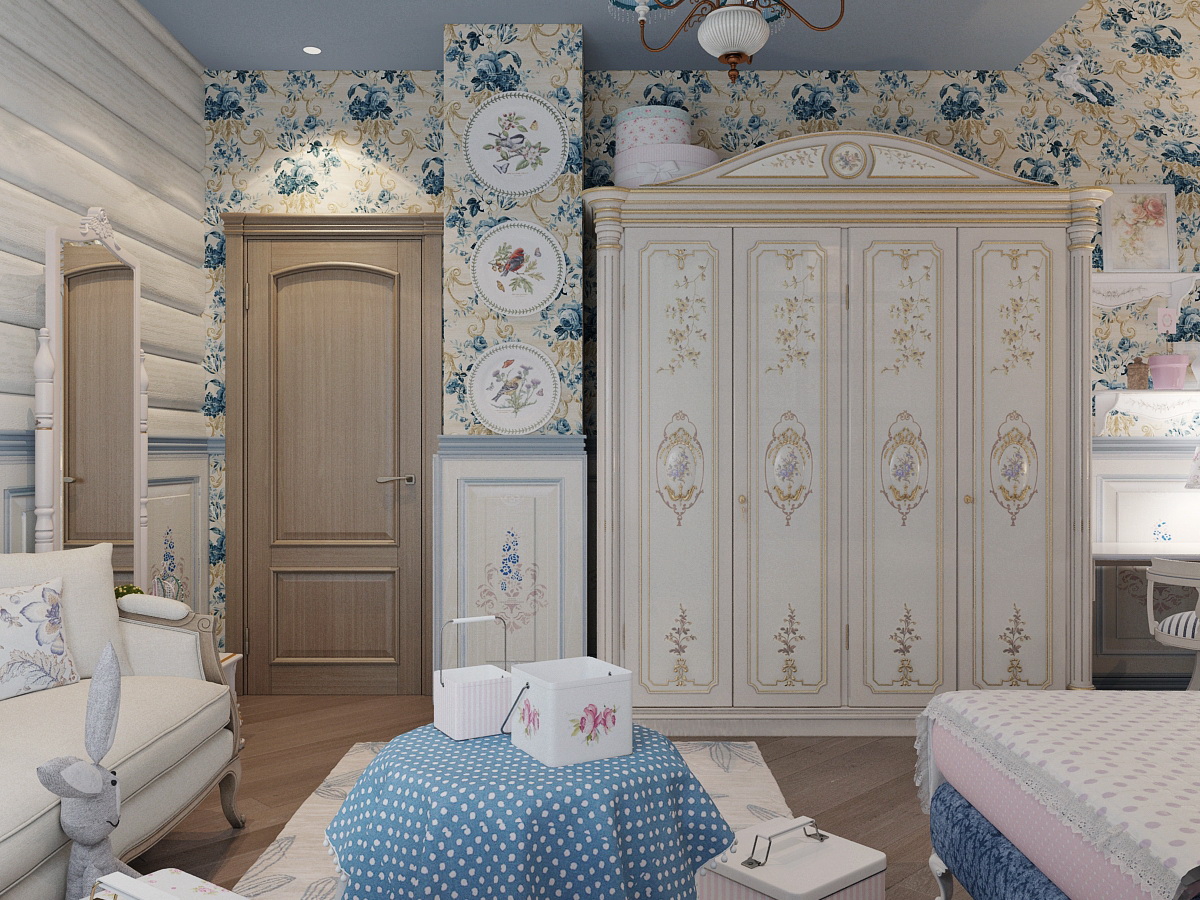 O quarto é um lugar para dormir e relaxar, então seu interior é mais frequentemente projetado em uma gama calma. Para a decoração da sala, eles usam papel de parede com um padrão discreto em cores pastel ou combinam telas de cores simples com um acento brilhante em uma das paredes na forma de uma imagem ou um ponto colorido.