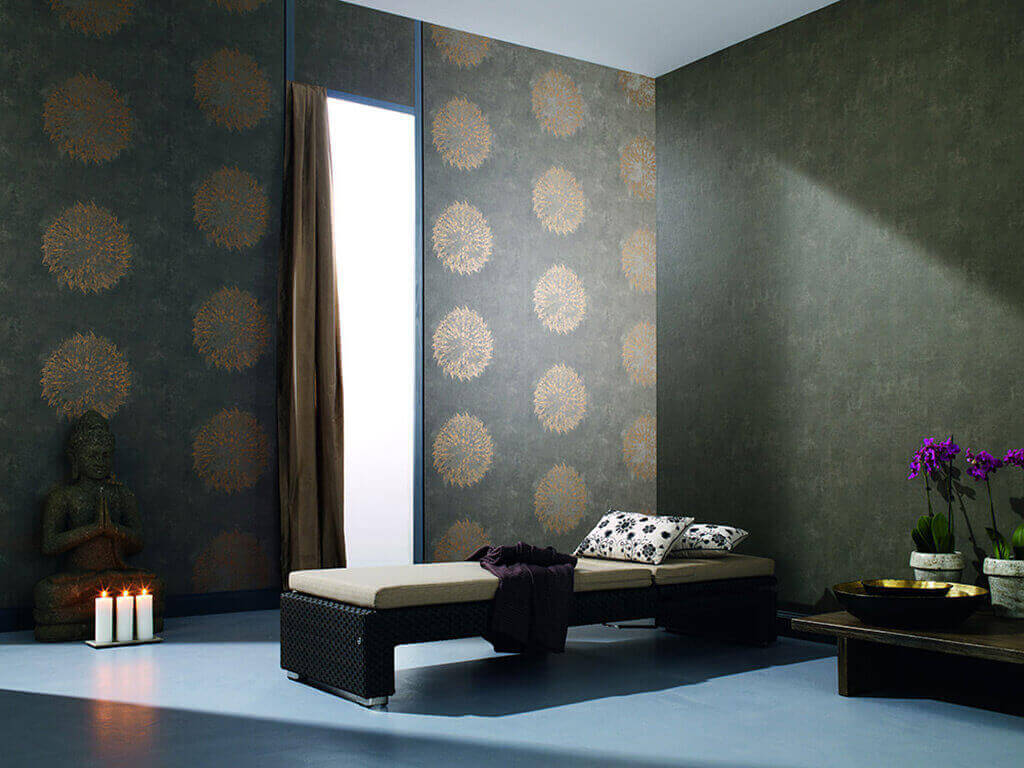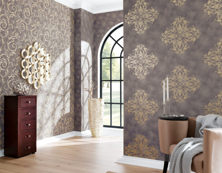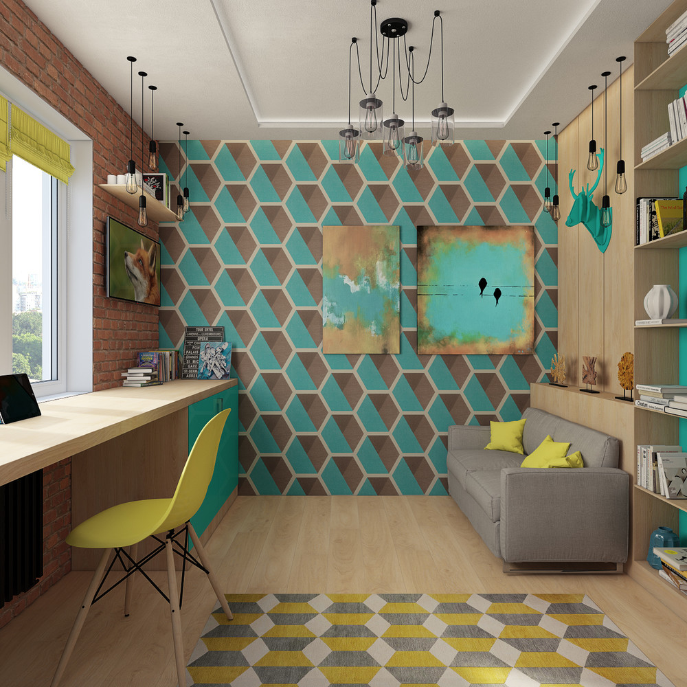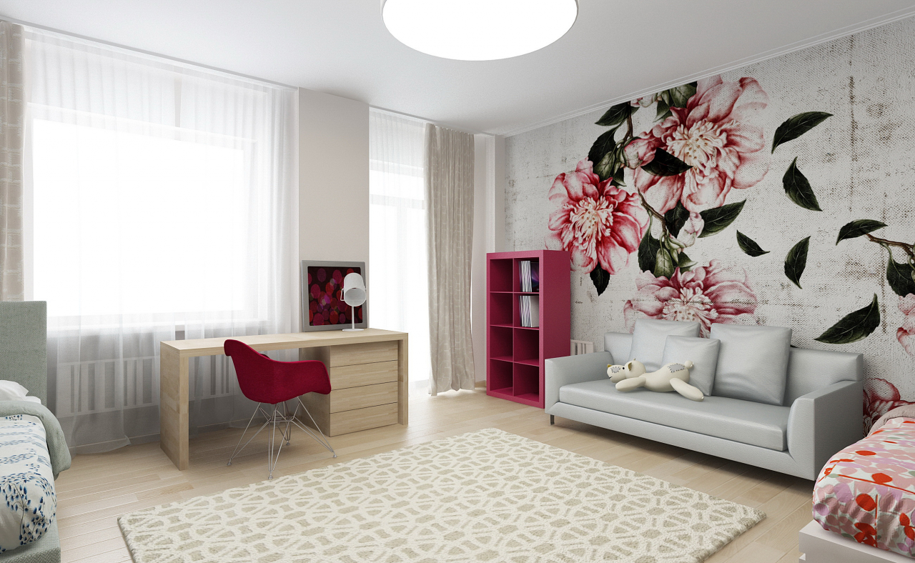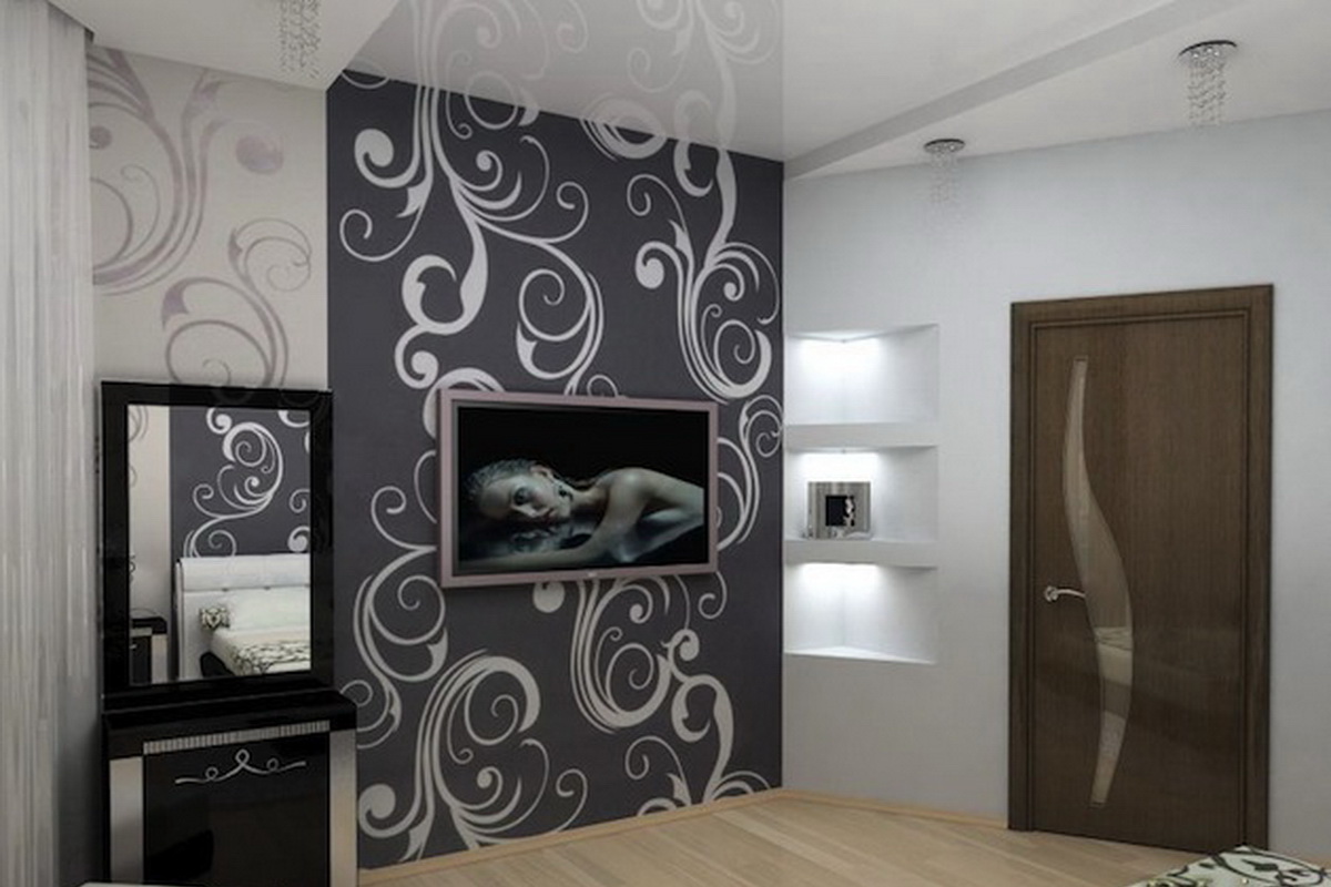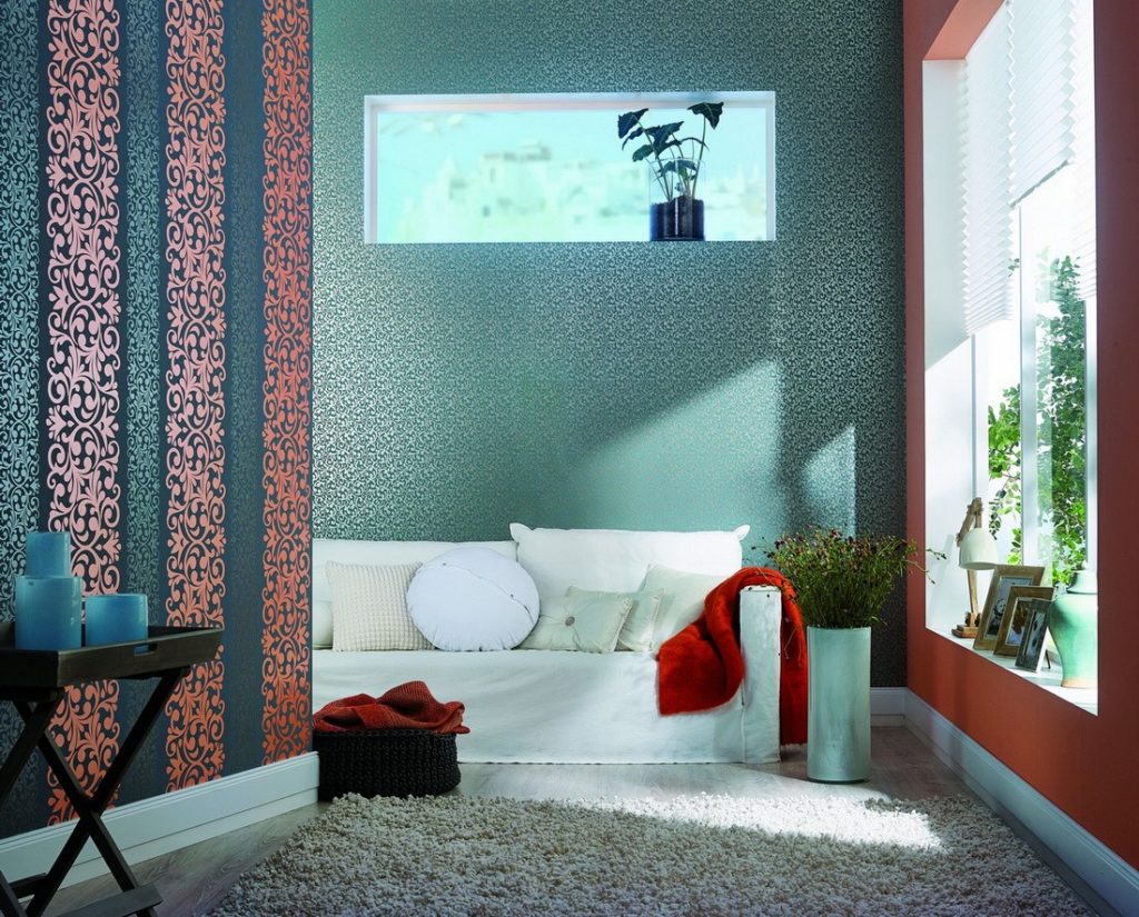 Com a ajuda de colar paredes com papel de parede diferente, você pode alterar visualmente o espaço e ajustar as proporções da sala.