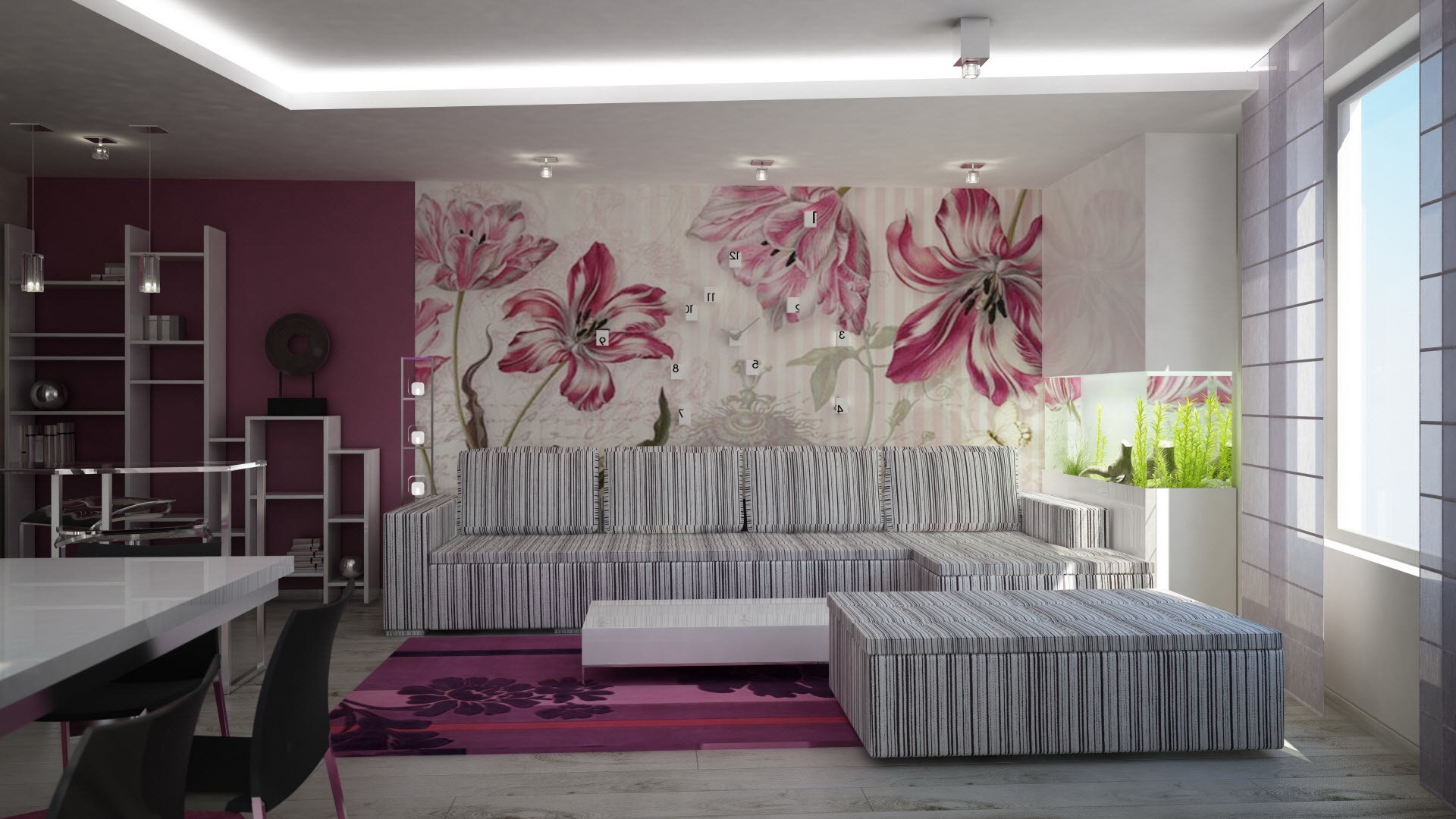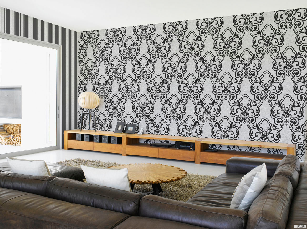 Essa combinação chama a atenção para a área selecionada e dá à sala um sabor único. Como um acento em vez de telas brilhantes, muitas vezes usam papel de parede com uma imagem interessante de flores e paisagens, vistas panorâmicas das cidades ou com um padrão abstrato.
