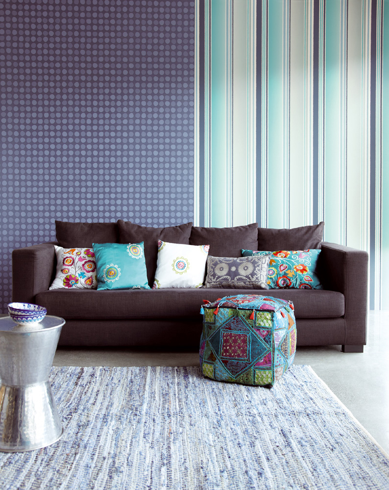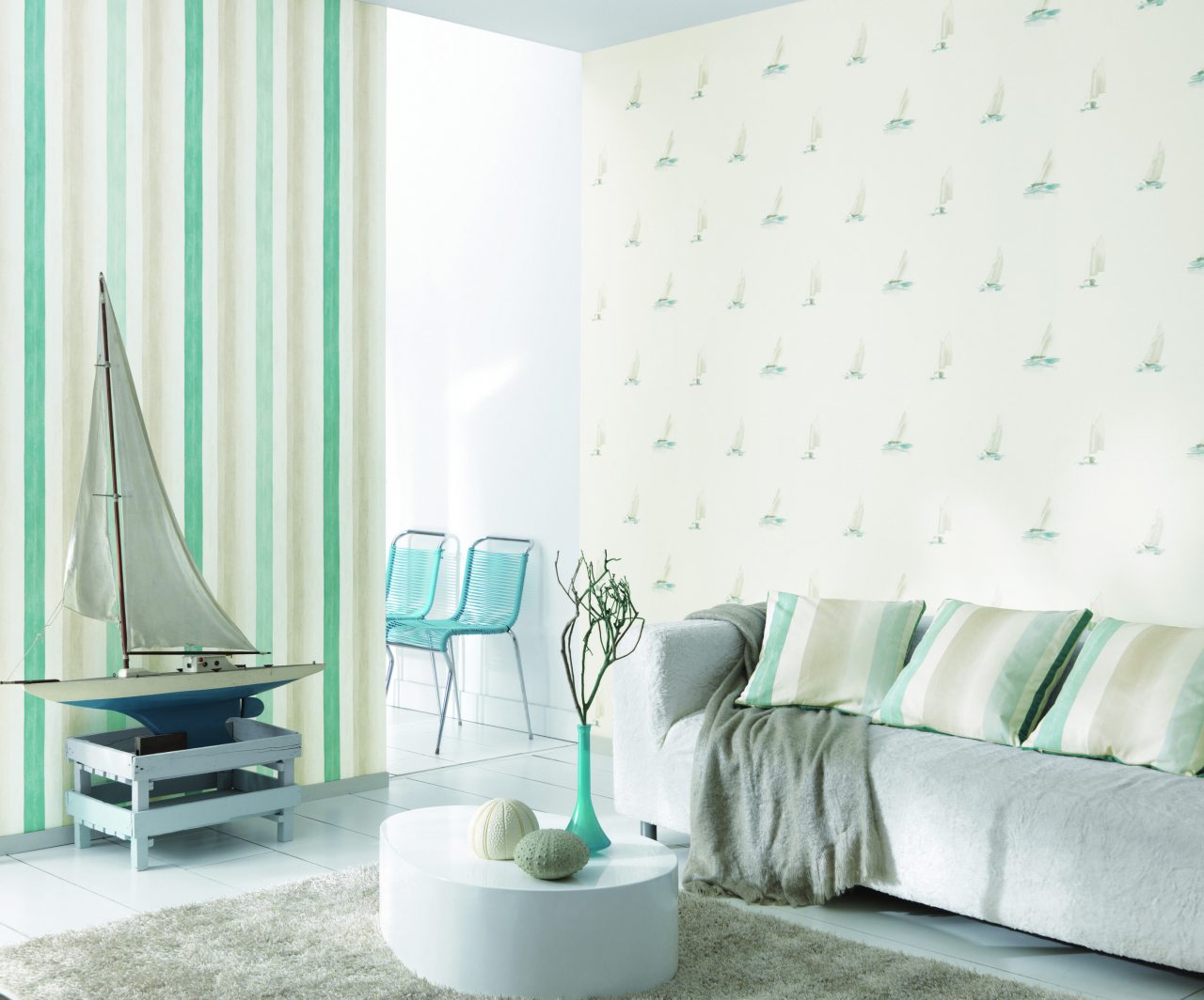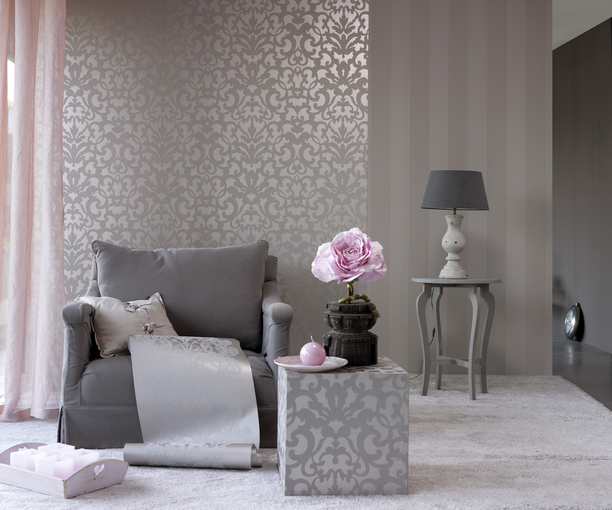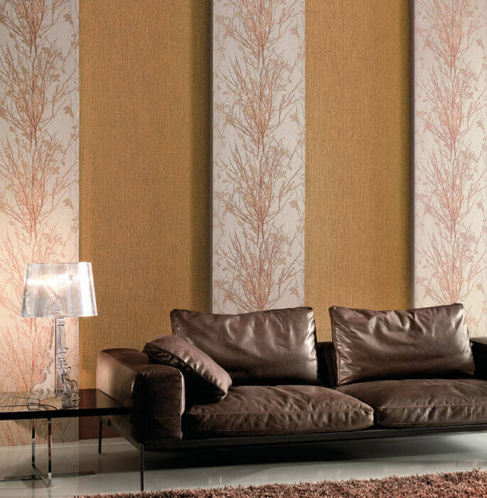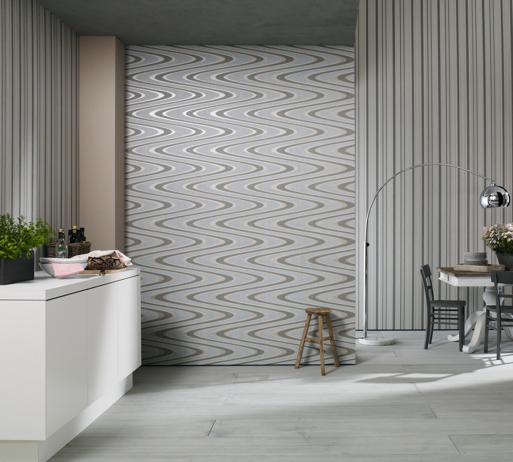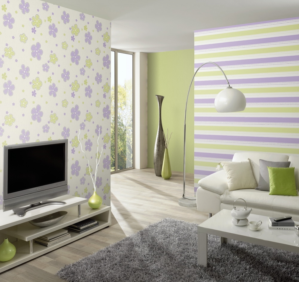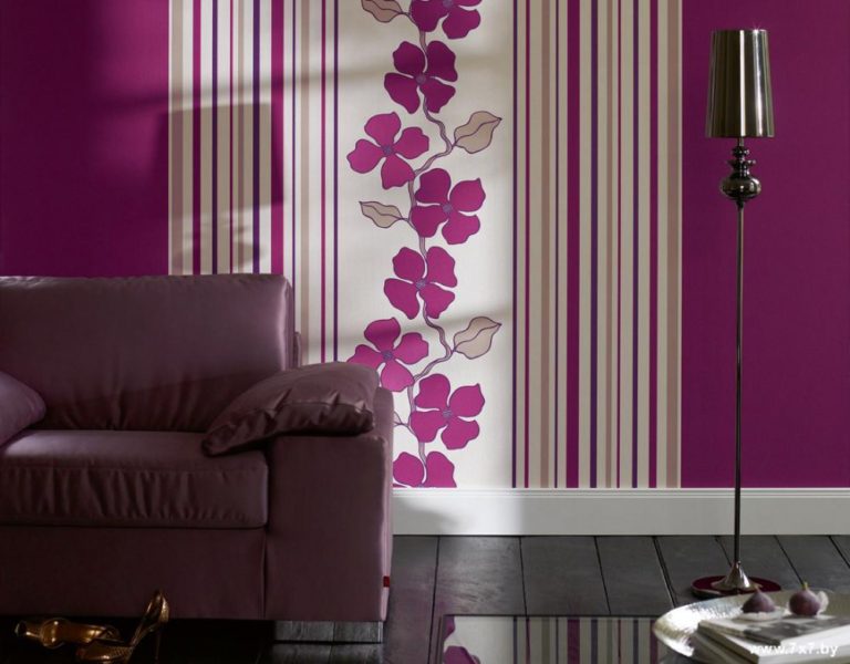 Monofônico e com um padrão na forma de listras largas ou estreitas são bem combinados. Tal decoração aumenta visualmente a altura do teto e cria o efeito de uma sala mais espaçosa.