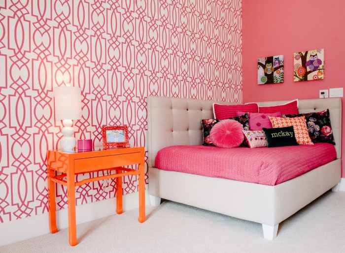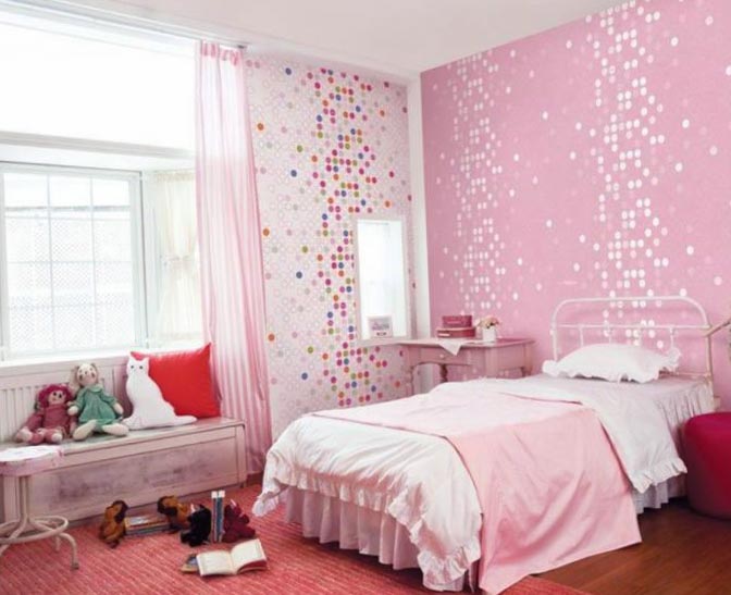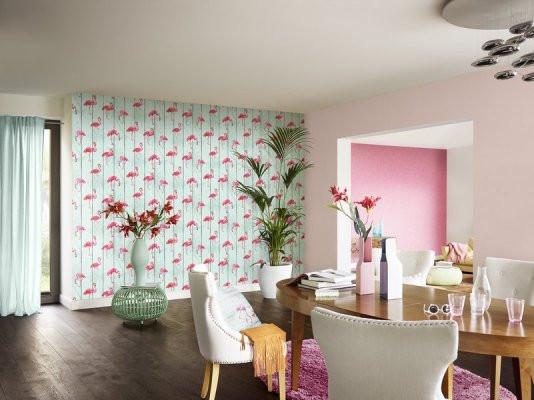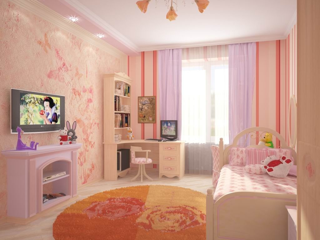 Entre as opções populares - parede papel de parede da decoração da mesma cor, mas diferentes tons. Tela gradeada em cores pêssego, bege, coral ou azul escuro pode ser posicionada horizontalmente e verticalmente.