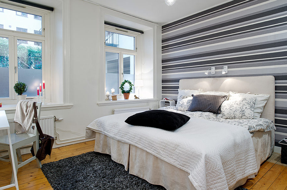 No entanto, você não deve colar papel de parede em todas as paredes com listras: o mesmo tipo de decoração rapidamente se torna entediante, e muitas pequenas listras podem causar fadiga. Opção - uma combinação de uma decoração em uma tira com o monótono ou decorado com um padrão inconspícuo telas de cor.