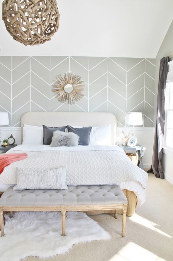 Listrado como uma gaiola, você pode selecionar uma das paredes, por exemplo, aquela à qual a cabeceira da cama se encontra. Esta é uma solução moderna que é frequentemente usada no design de quartos.