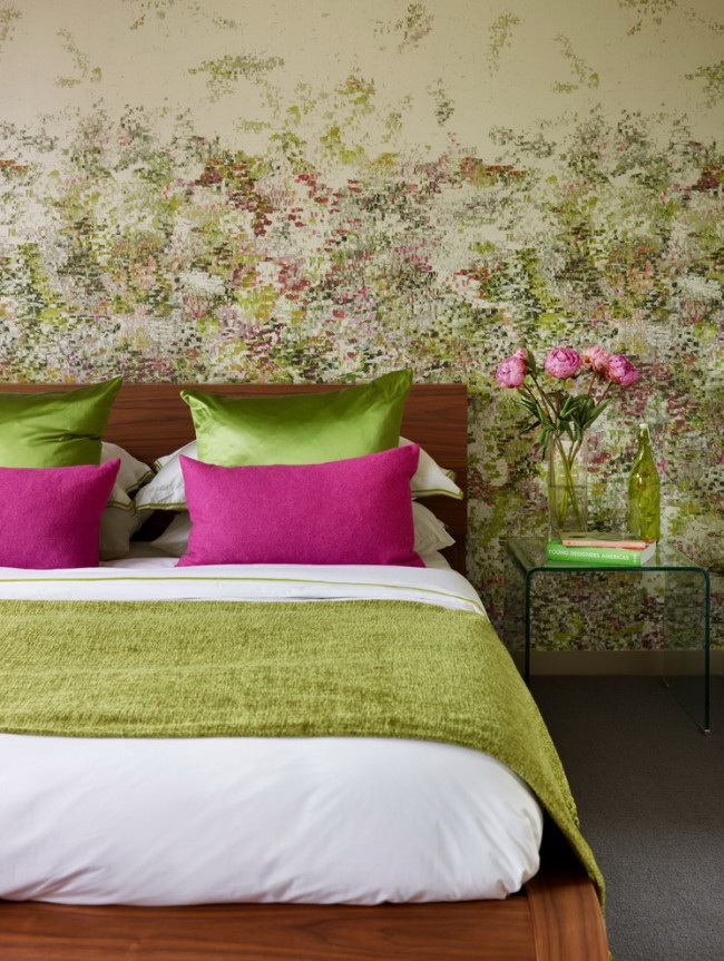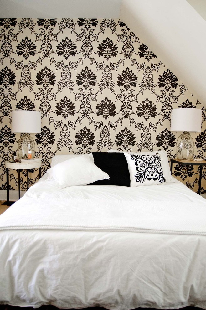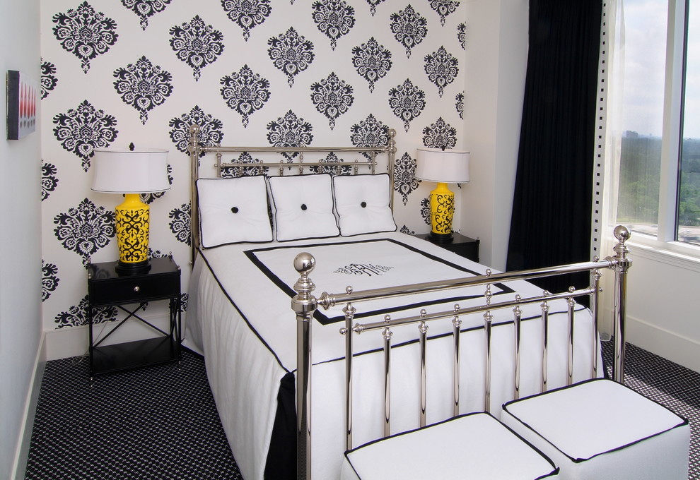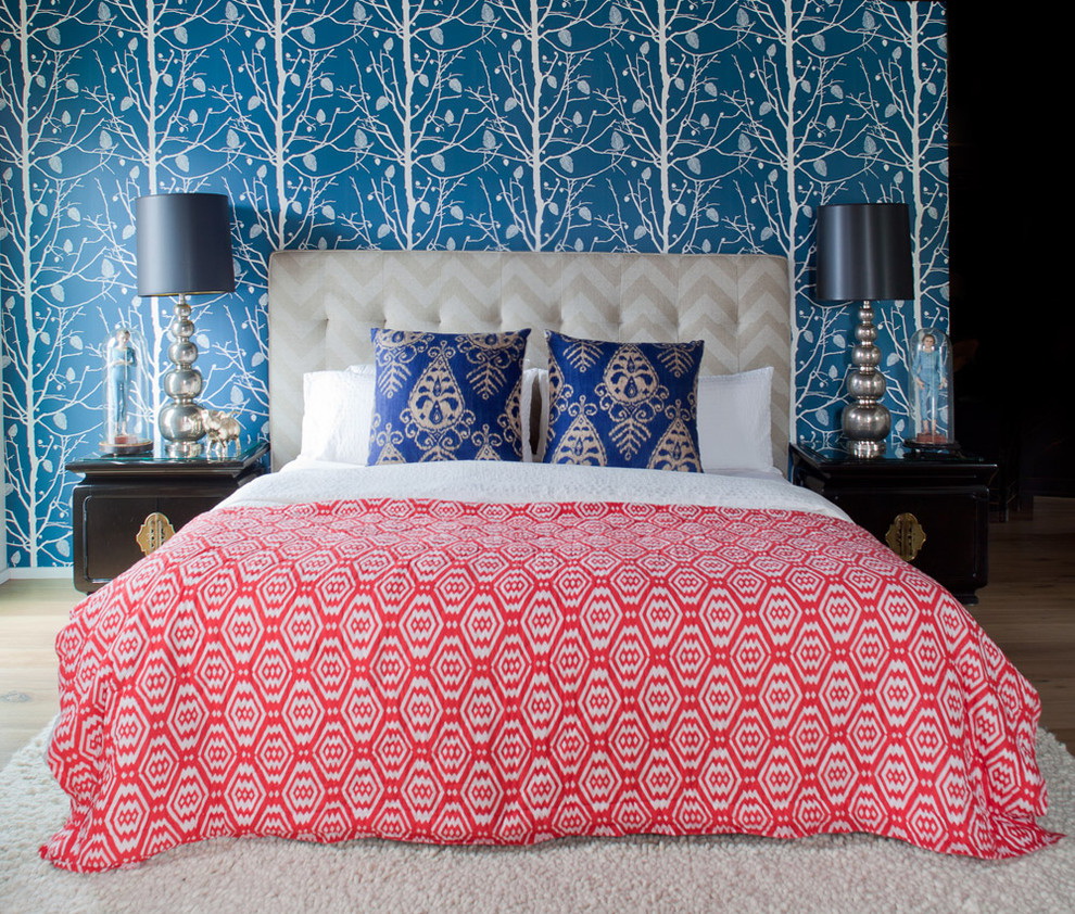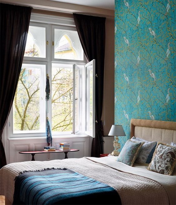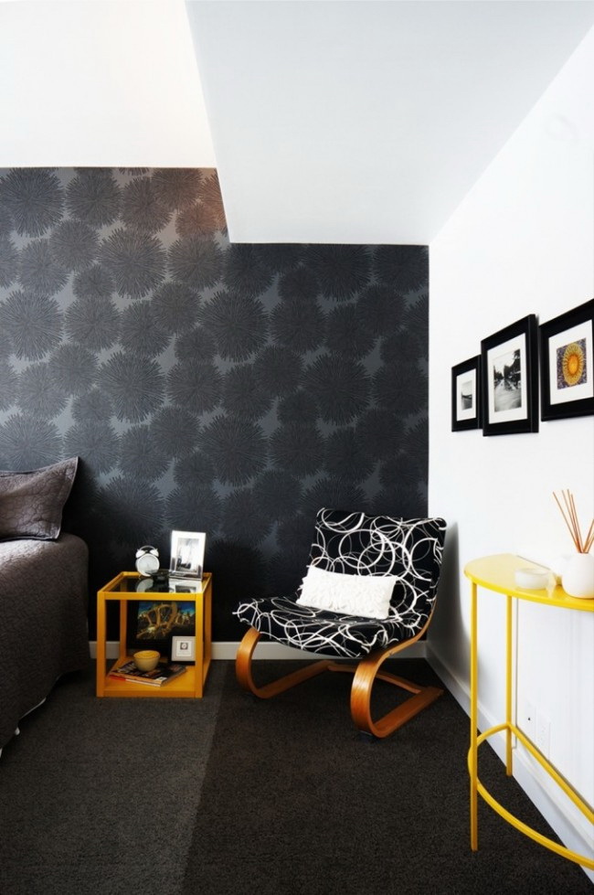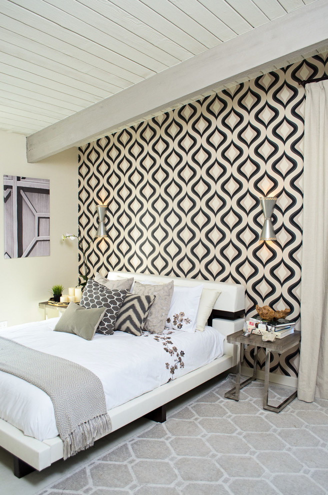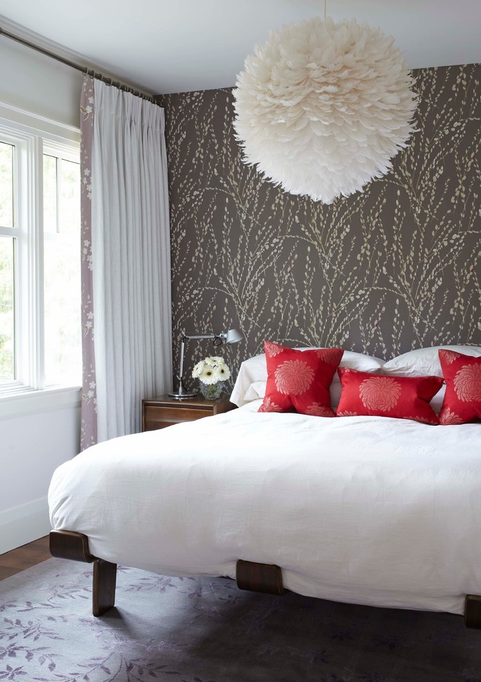 - o jogo em contrastes - a seleção de papel de parede com um grande padrão de apenas uma parede, por exemplo, adjacente à cabeceira da cama;