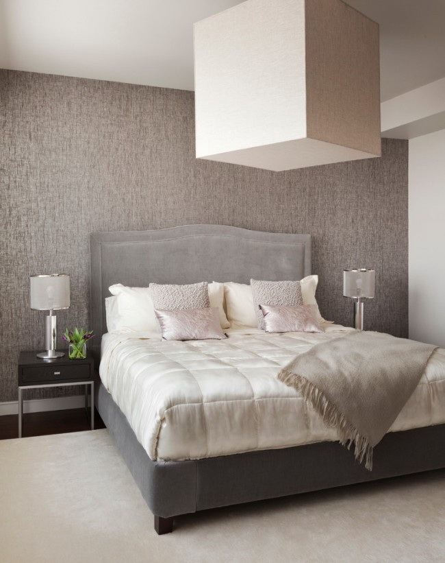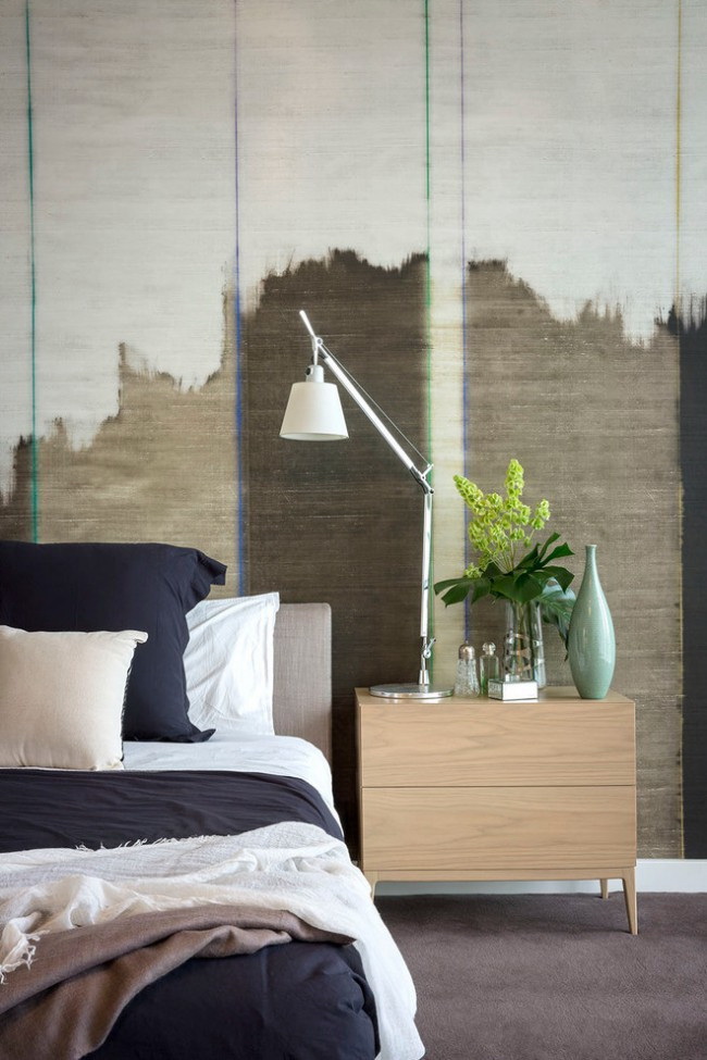 Para mim, um quarto, este lugar é principalmente para descanso, sono e de forma alguma atividade ou trabalho em um computador, então eu prefiro cores escuras no meu interior adormecido, que têm paz de espírito, tranquilidade e pacificação. Violeta, bege escuro, tons necessariamente quentes e, de preferência, com base em tecido, uma vez que acrescenta o máximo conforto, além de permitir a passagem do ar. Inesperadamente, uma célula com uma tira não parece ruim, graças a este artigo eu descobri uma combinação tão nova e lacônica para mim, mas novamente é importante que a sombra seja na maior parte escura, caso contrário a célula não terá que relaxar e descansar. Eu concordo, e até mesmo verifiquei que o padrão vertical “estende” significativamente a sala - uma excelente solução para Khrushchev ou apartamentos com tetos baixos. A principal coisa aqui é que não deve haver desenhos verticais nalapistas, mas tudo foi limpo, experiente e elegante, caso contrário, vai cortar os olhos, especialmente se você combinar tons frios. Não se esqueça do papel de parede no teto, o artigo sobre eles não é mencionado, mas eles também criam um interior no quarto e devem estar em harmonia com o papel de parede nas paredes.