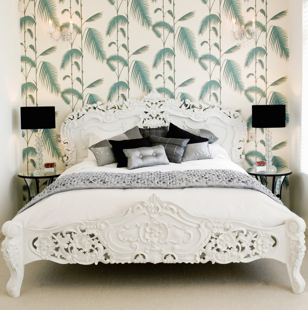 Ornamentos florais ou monogramas entrelaçados podem decorar as paredes do quarto no estilo shebbi-chic ou Provence.