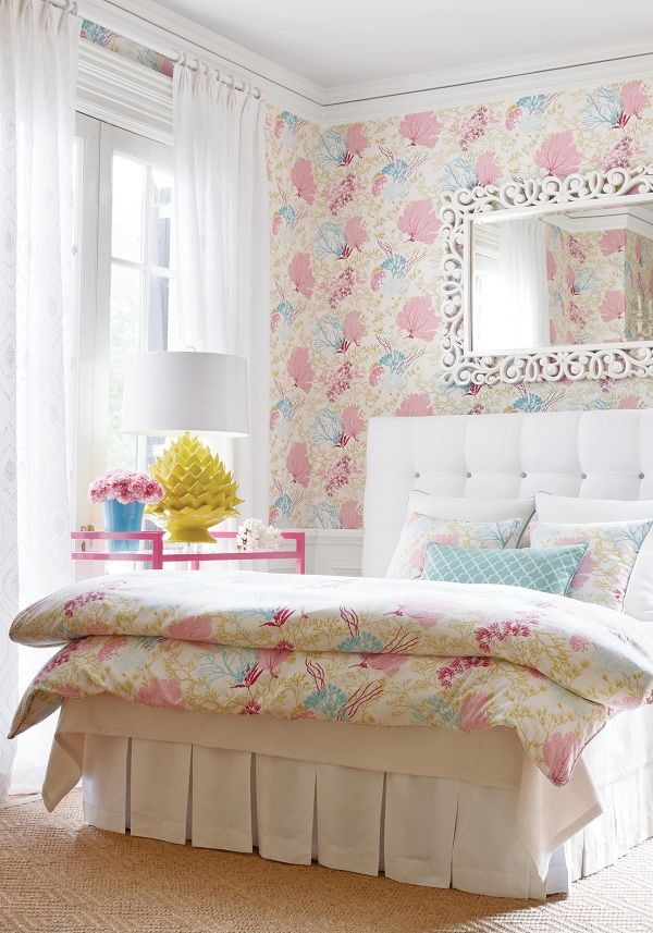 Para os quartos dos casais, o preenchimento total de paredes com flores pode não ser adequado. Mas se você combiná-los com listras direcionais ou cores quadriculadas, as flores serão equilibradas.