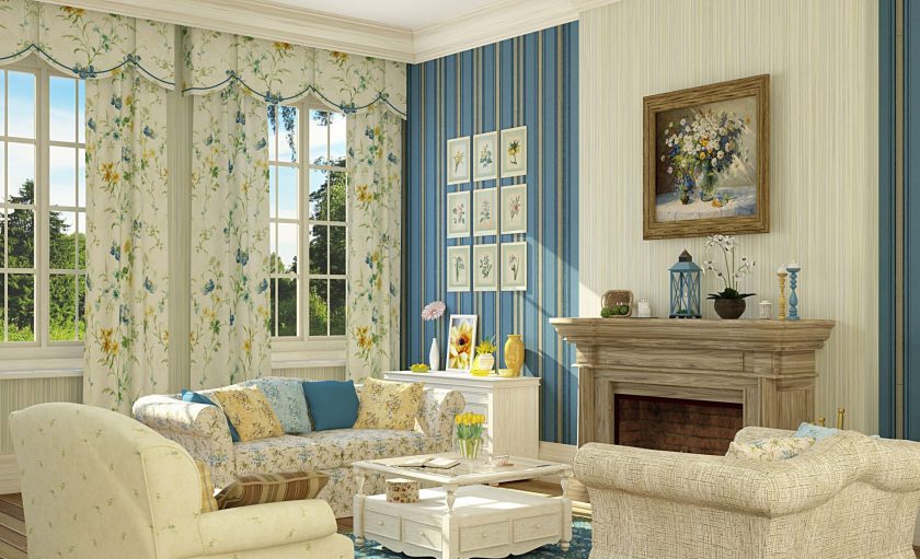 É importante garantir que o padrão no papel de parede se cruze com o padrão das cortinas. Então harmonia provençal será traçada ao longo do interior da sala de estar.