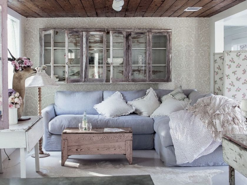 A mobília é muitas vezes artificialmente envelhecida ou restaurada, preservando sua aparência natural. Mobiliário áspero feito de madeira danificada pelo furo parece harmoniosamente. A textura pode ser suave, mate, com cantos suaves.