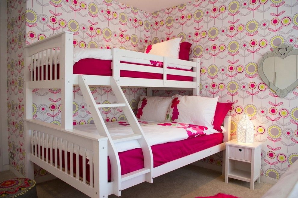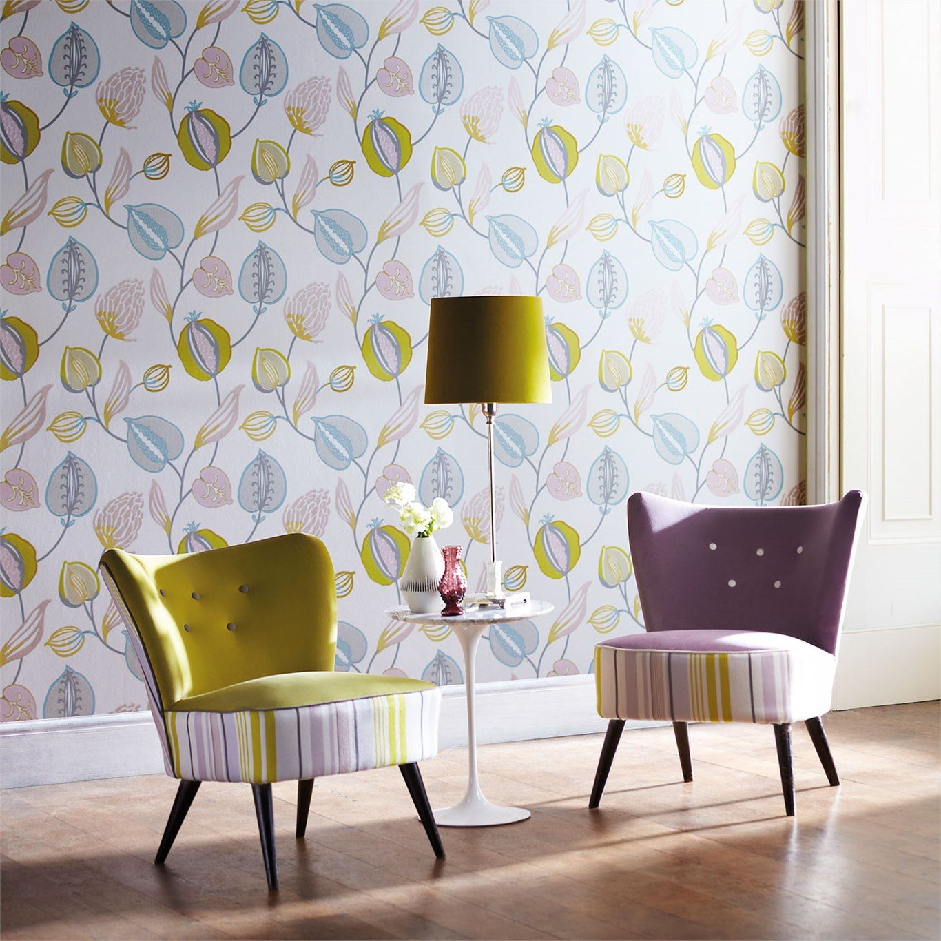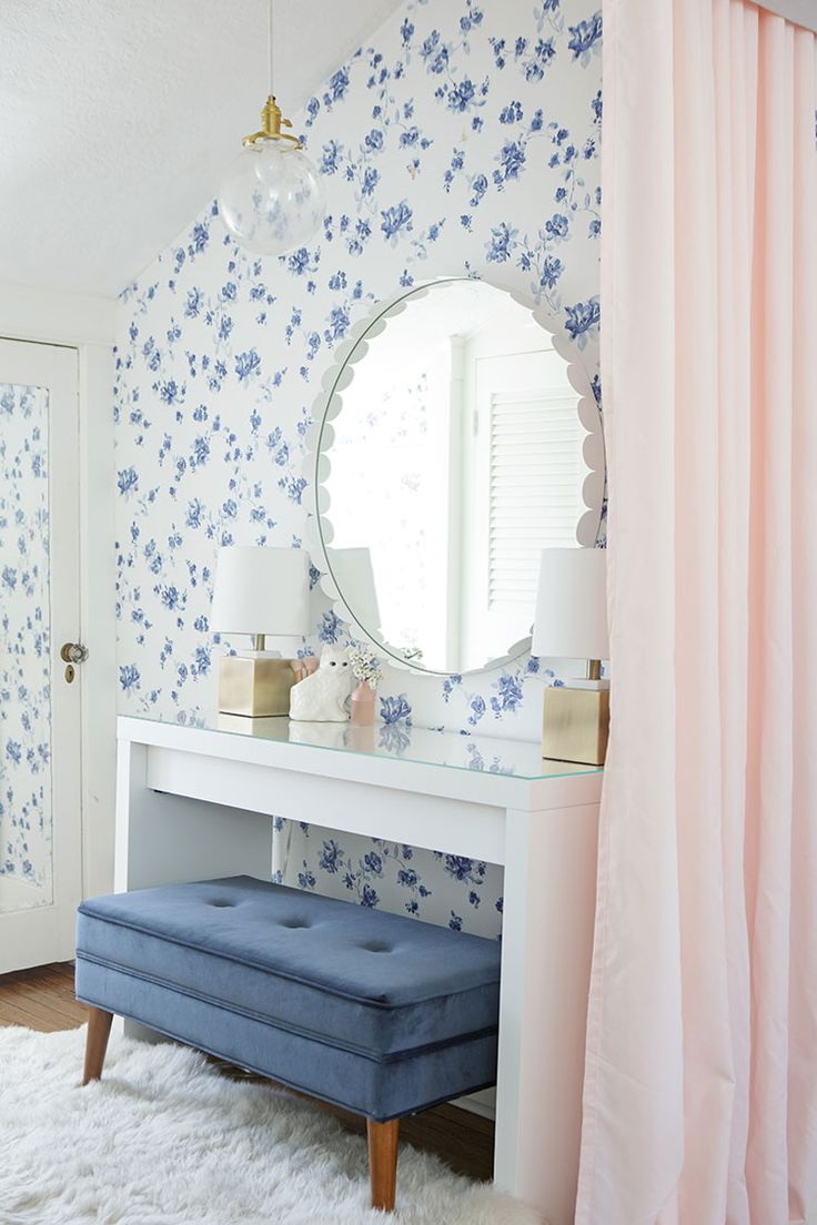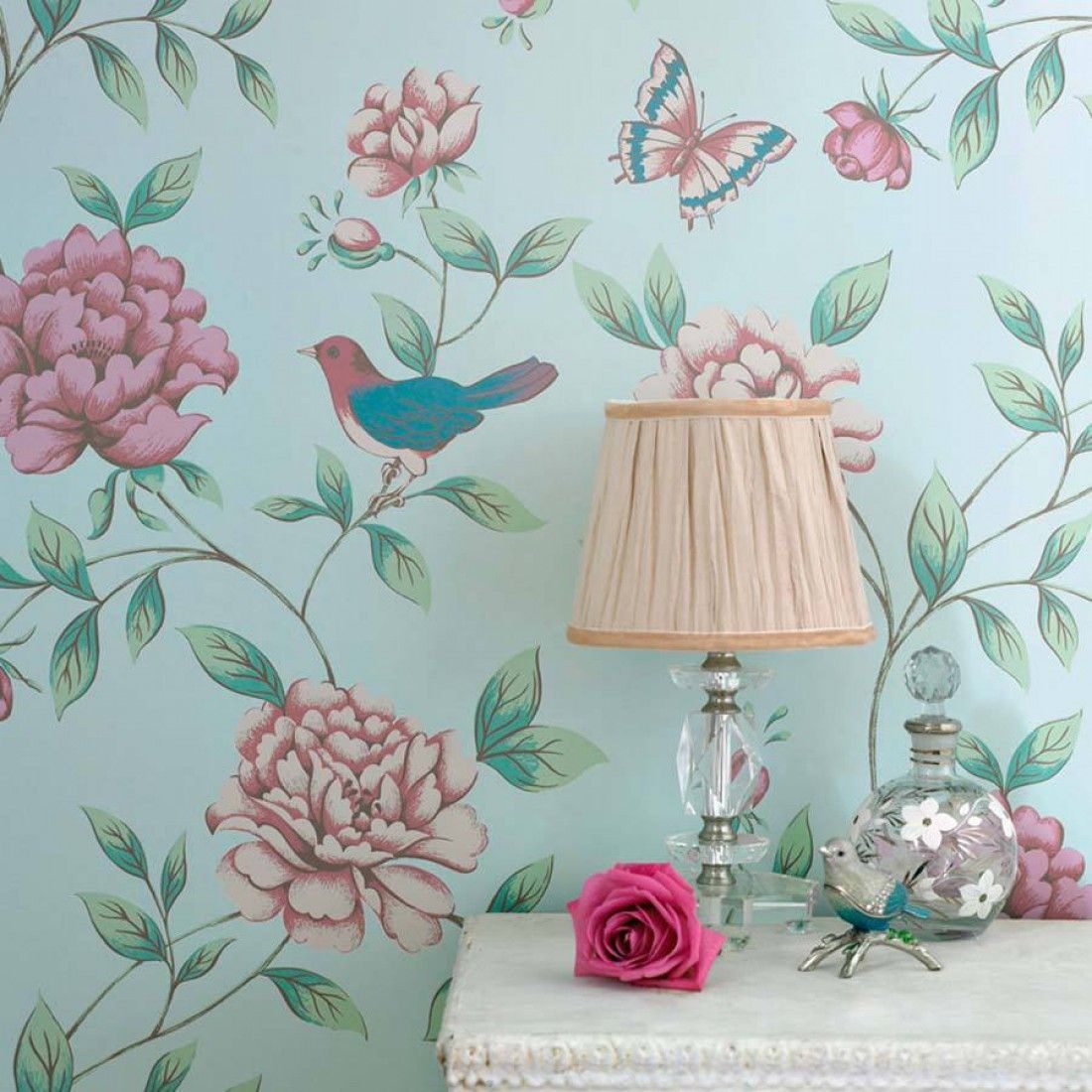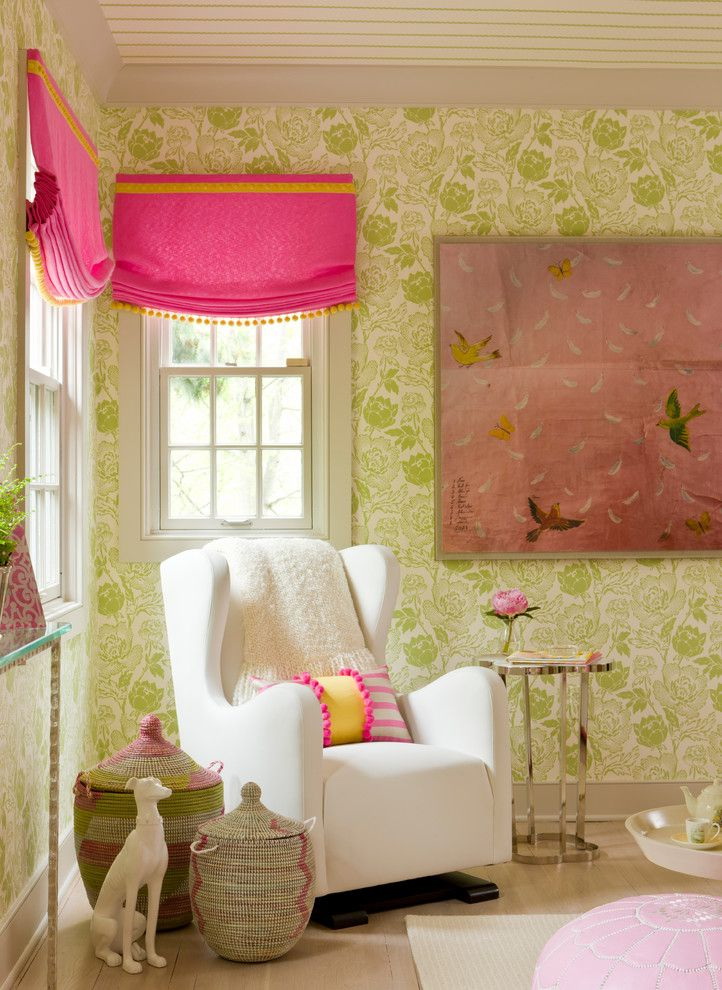Para meninas papel de parede adequado com flores, pássaros e outros elementos delicados. Cor escolher pó silenciado.