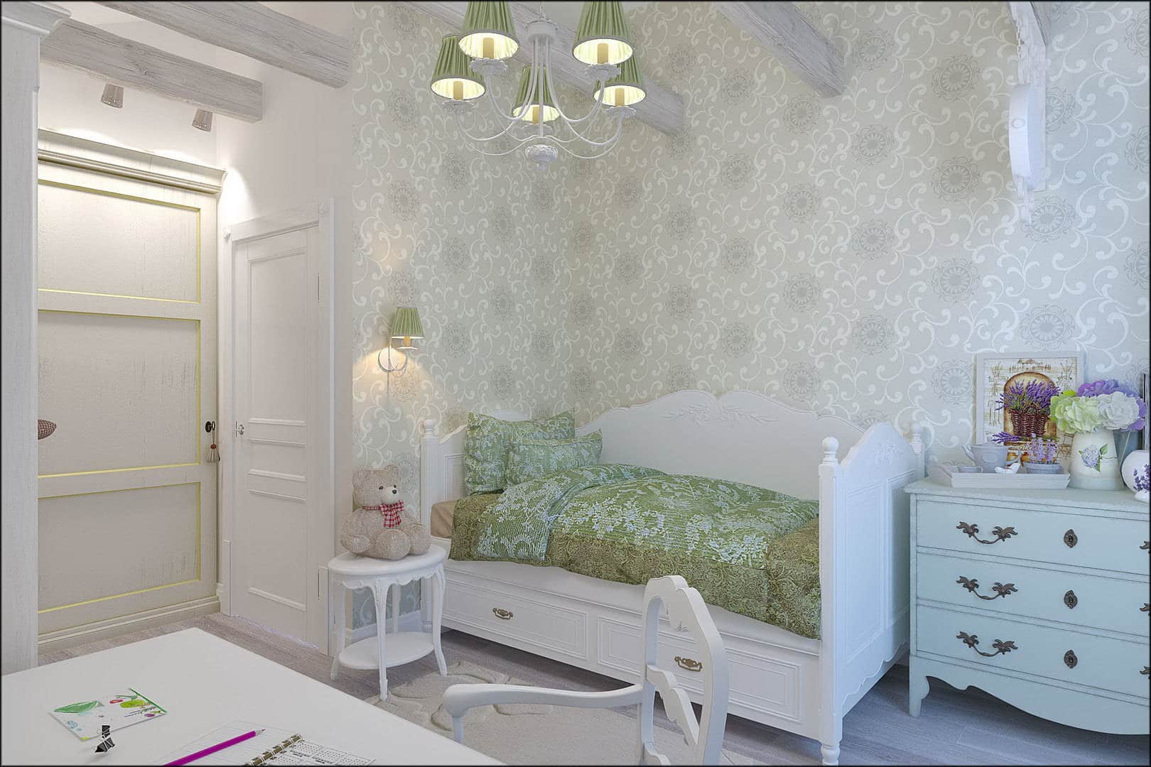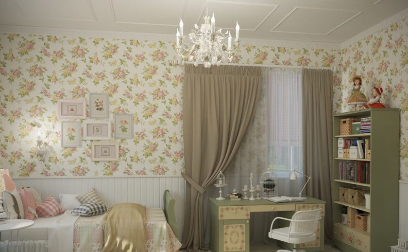 Para as crianças pequenas, use o papel de parede de todos os tons suaves de verde. Esta é a cor mais útil para a visão, e se encaixa bem com o estilo provençal.