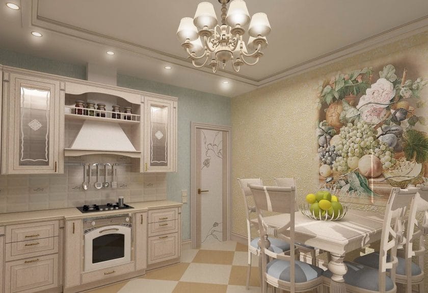 A cor do papel de parede para a cozinha provençal pode ser qualquer. Você só deve evitar sombras brilhantes e contrastantes.