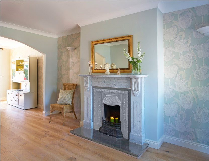 Papel de parede da província francesa é produzido com diferentes padrões e desenhos. A opção mais fácil é imitar uma parede rebocada.. Para conseguir essa ilusão, você precisa usar papel de parede pronto para a pintura, no qual há uma gravação com a imagem da parede crua. Ou para este propósito você pode usar liquido papel de parede, sem manchas minerais.